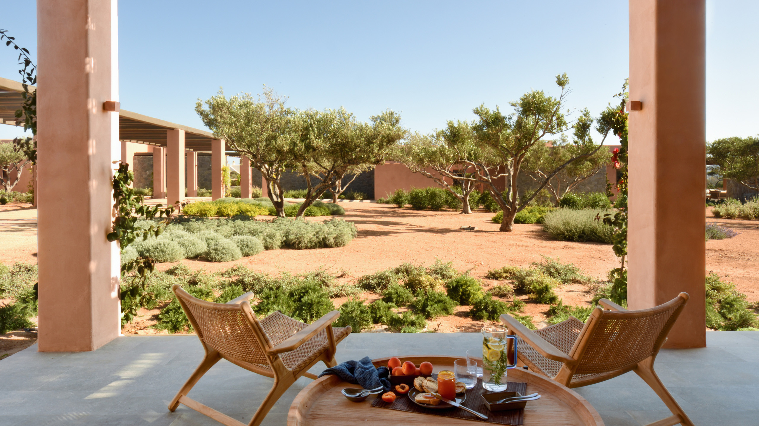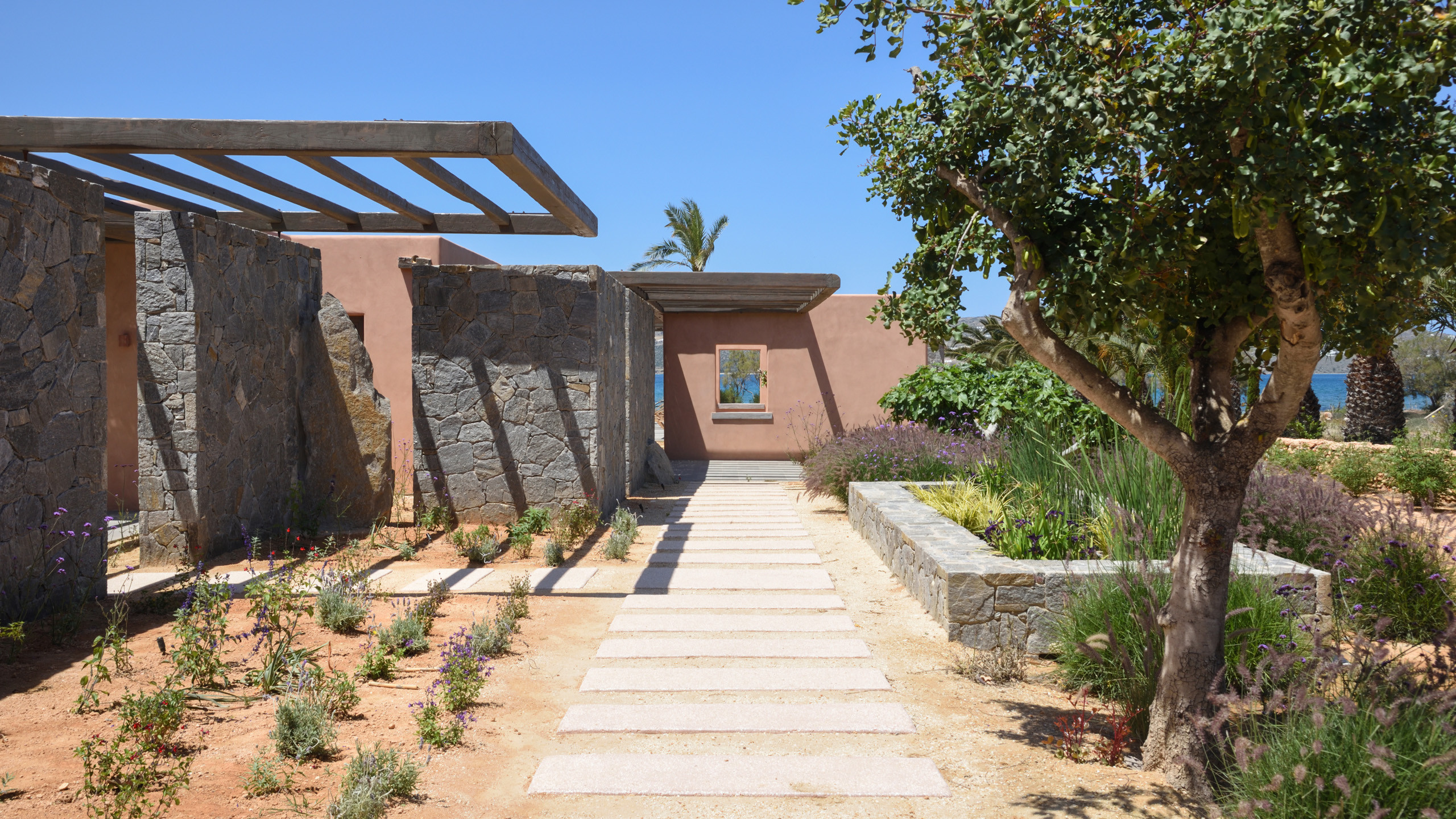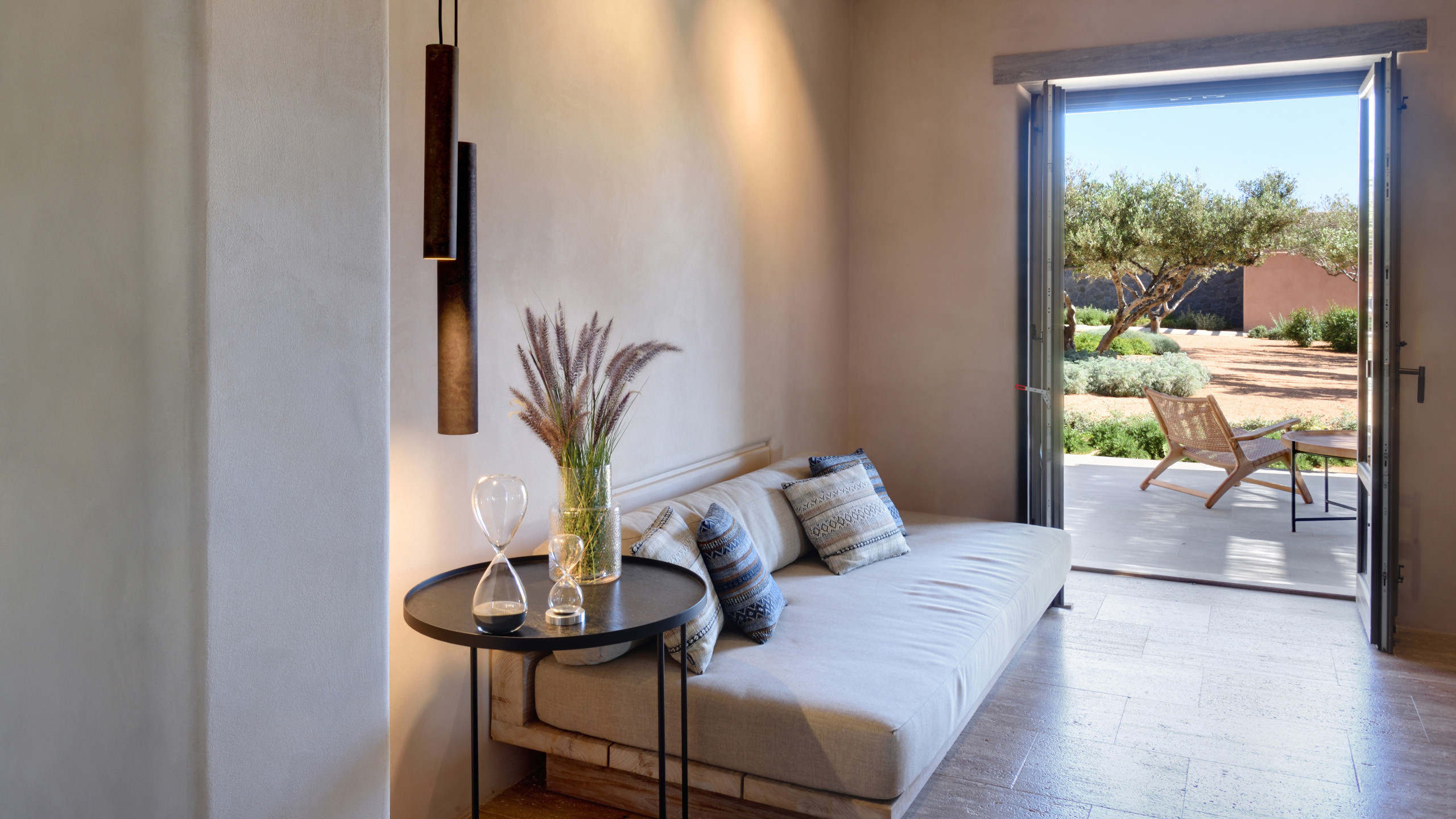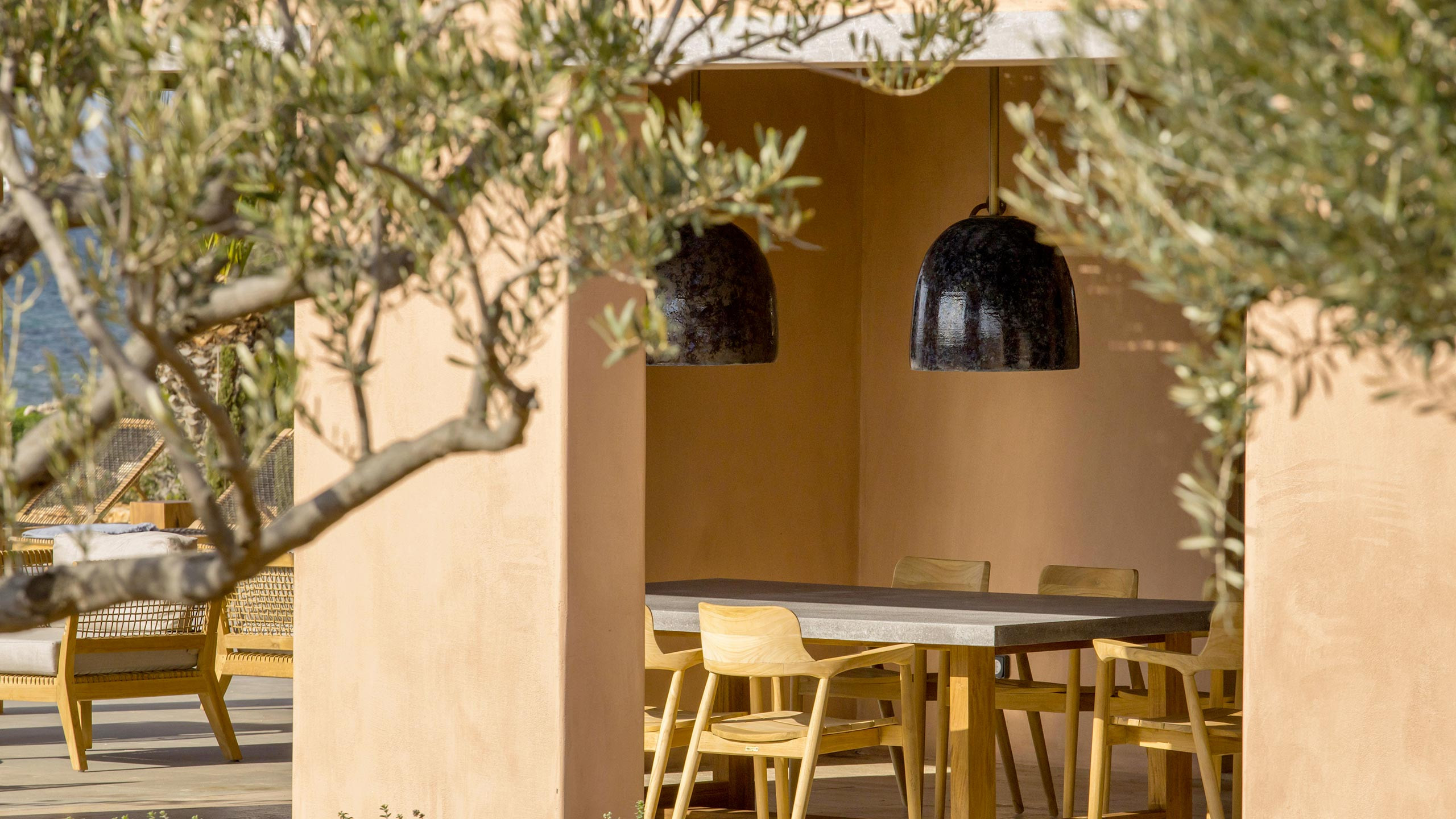 The pool, positioned perpendicular to the coast, is perfect for cooling off during the hottest hours of the day, with a pleasant shaded relaxation area nearby and a well-designed dining space beneath the portico, seamlessly connected to the kitchen to facilitate the work of our chefs. The colors and materials used in the building's design are captivating, with pastel shades rarely seen in this part of Greece, contributing to a relaxing and sophisticated atmosphere.