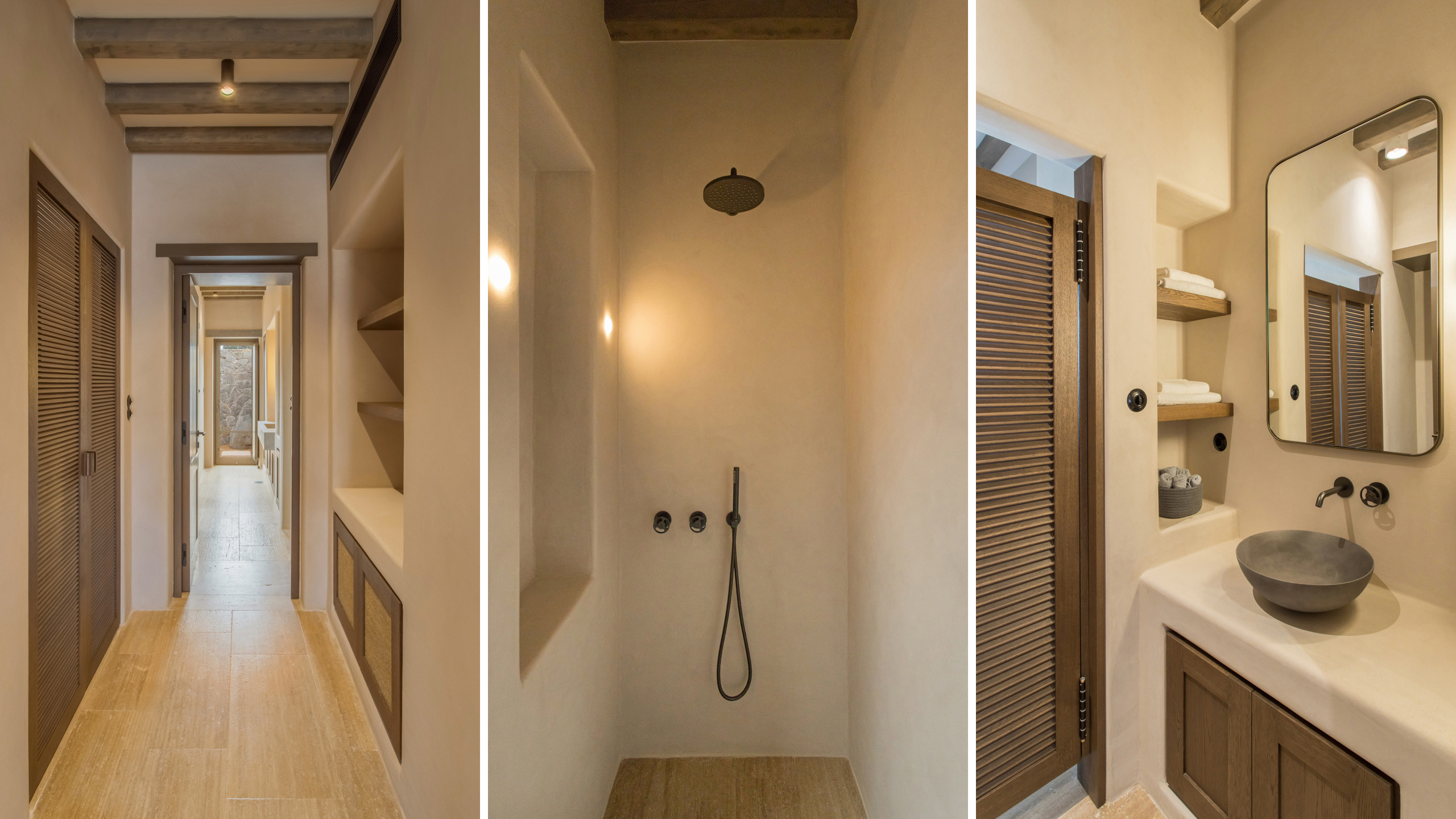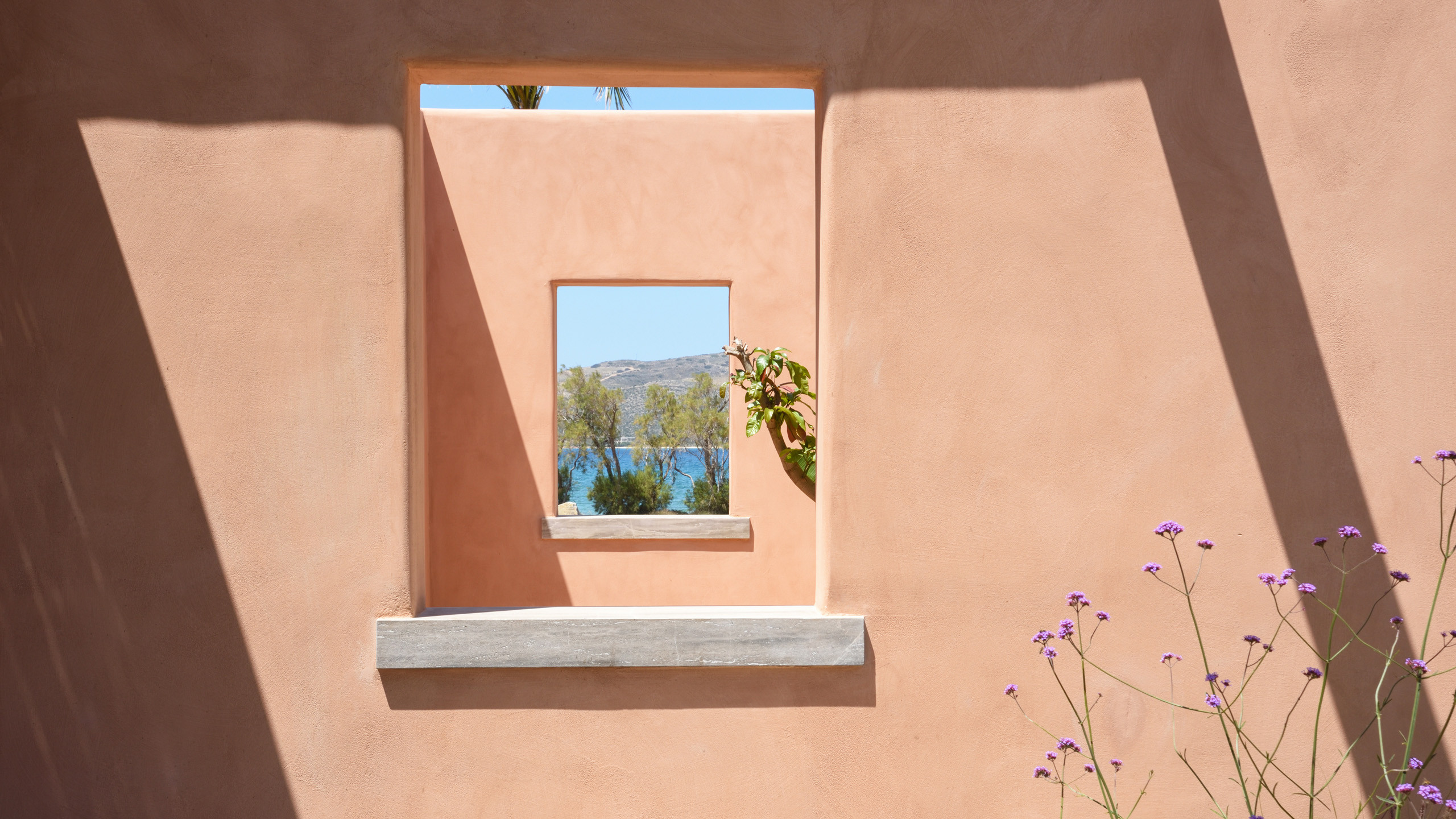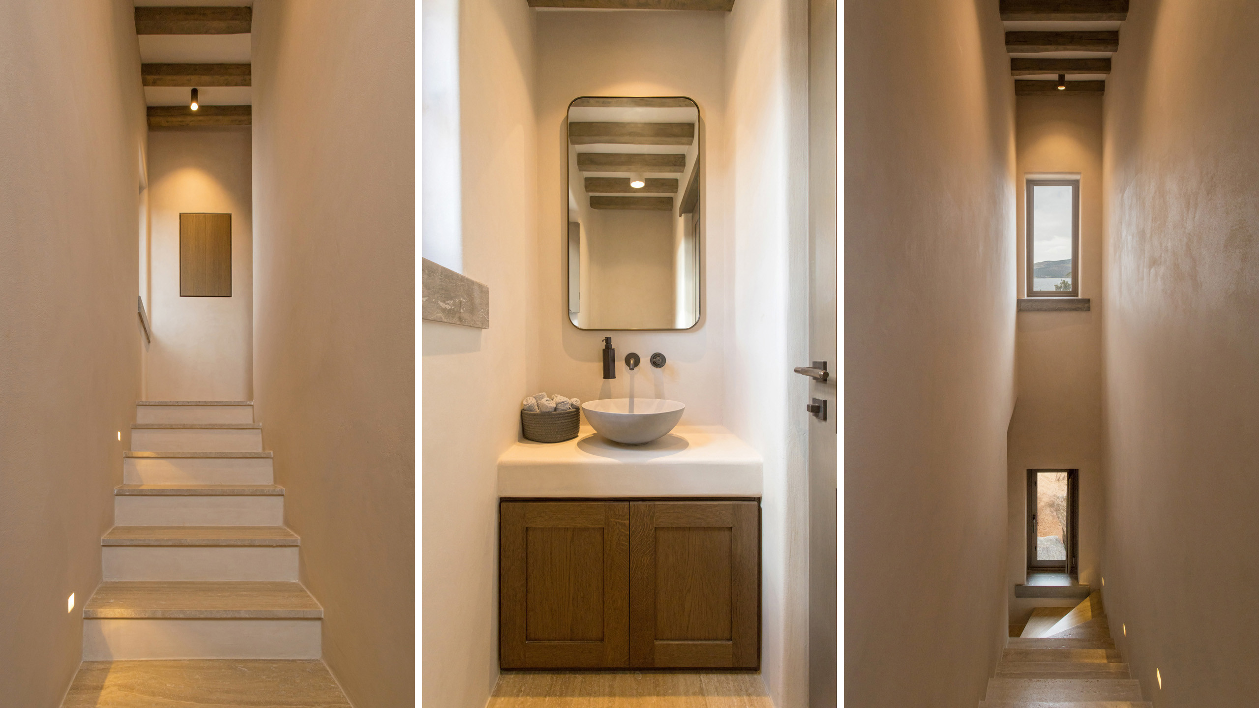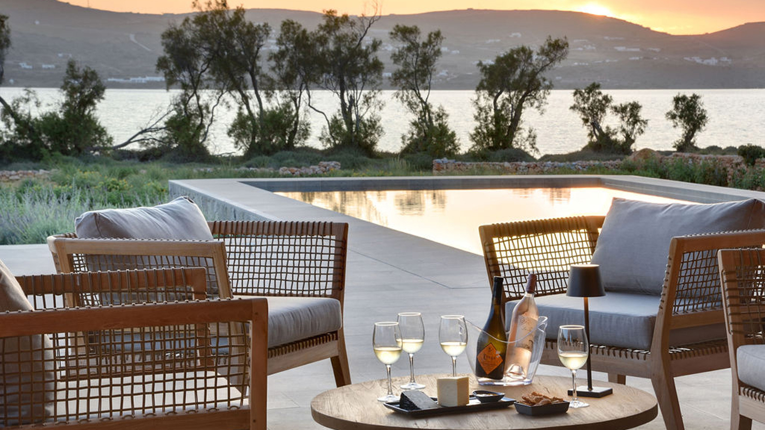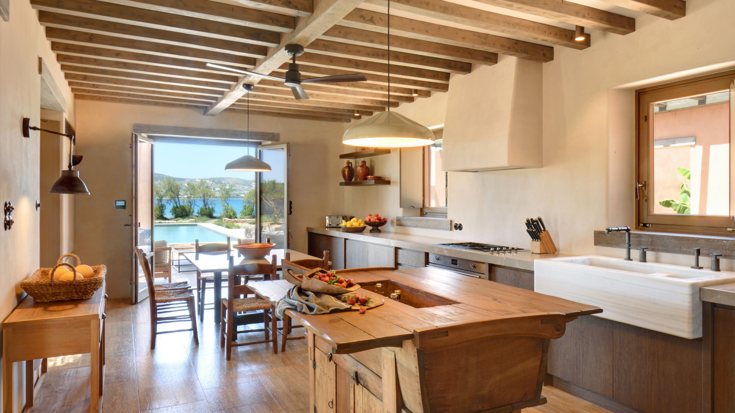 The pool, positioned perpendicular to the coast, is perfect for cooling off during the hottest hours of the day, with a pleasant shaded relaxation area nearby and a well-designed dining space beneath the portico, seamlessly connected to the kitchen to facilitate the work of our chefs. The colors and materials used in the building's design are captivating, with pastel shades rarely seen in this part of Greece, contributing to a relaxing and sophisticated atmosphere.