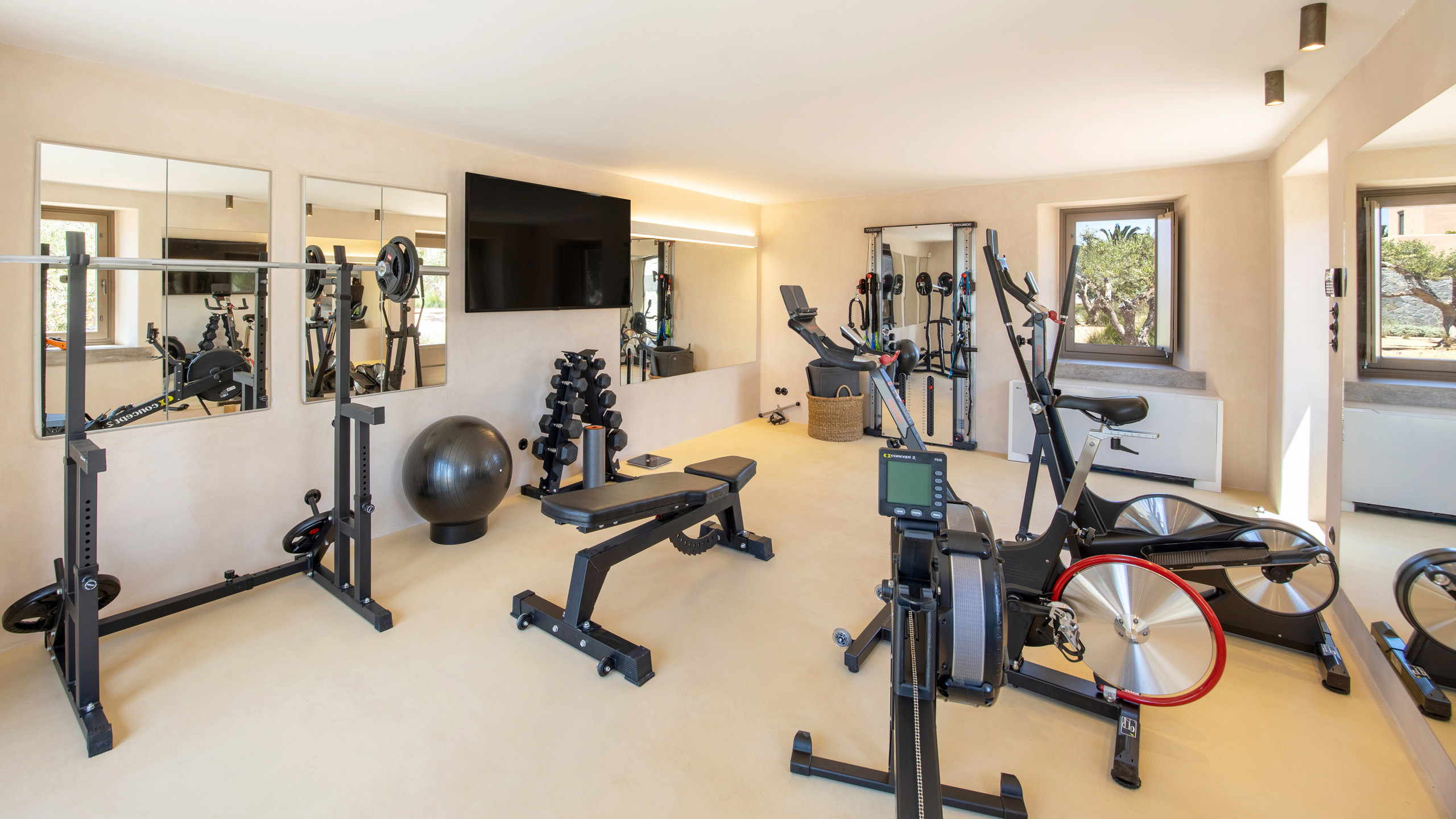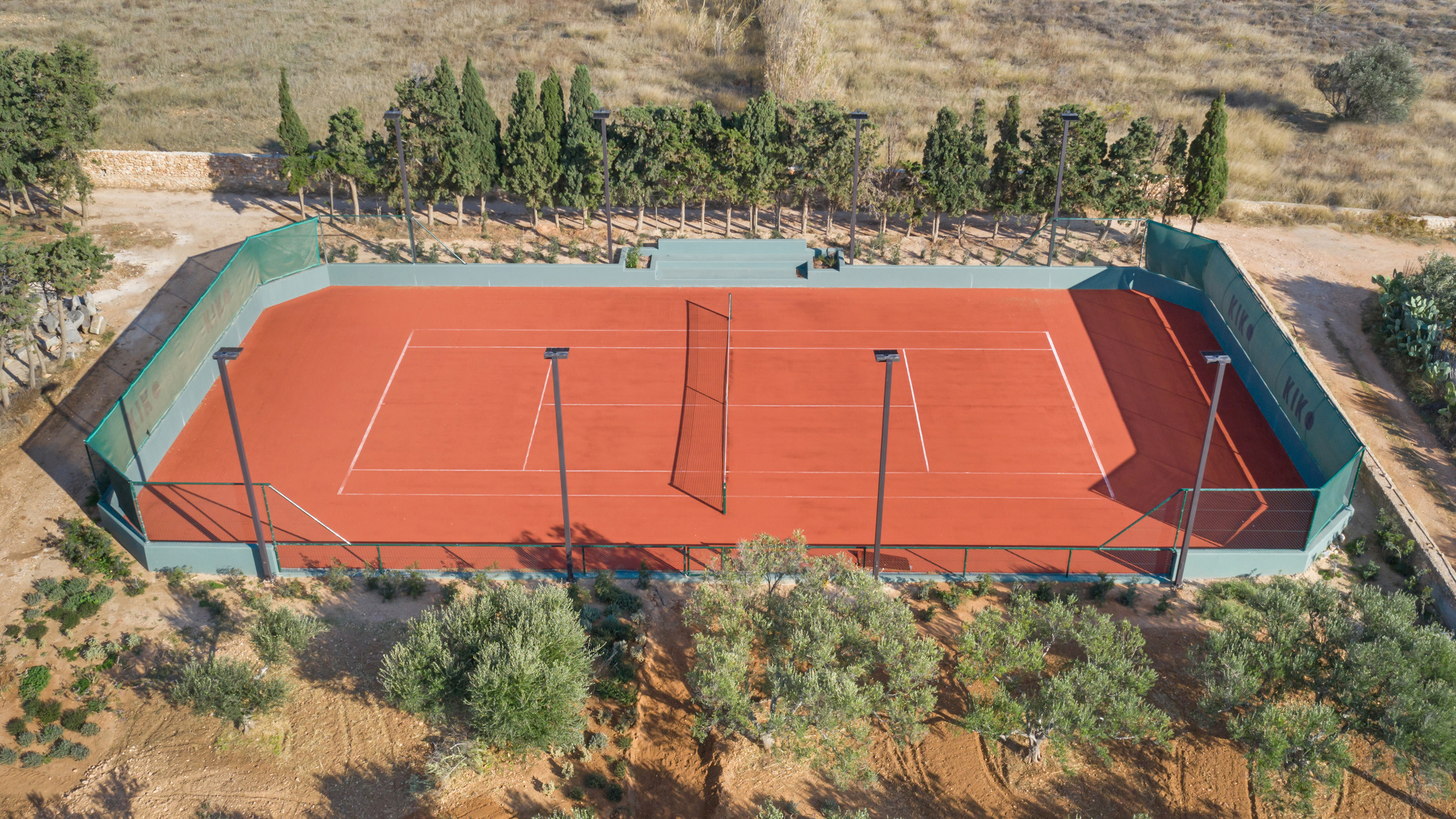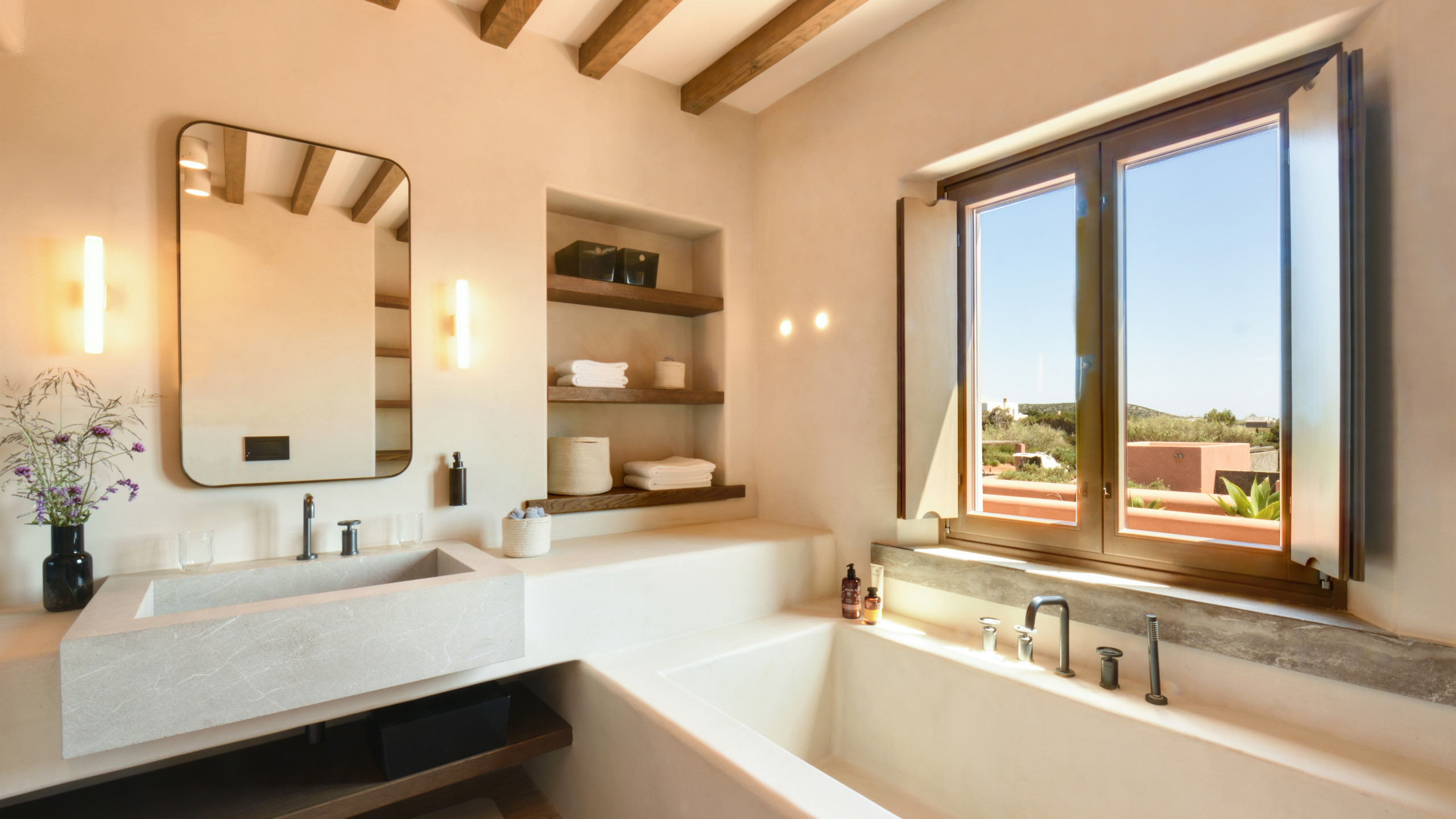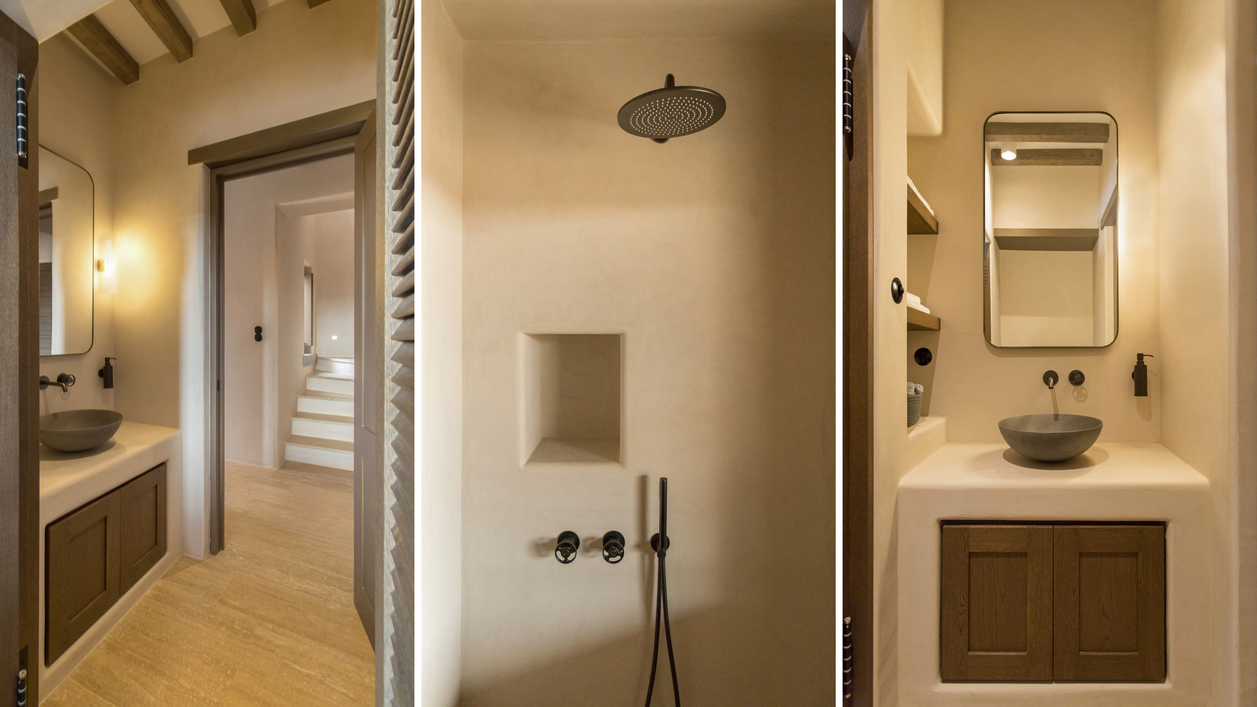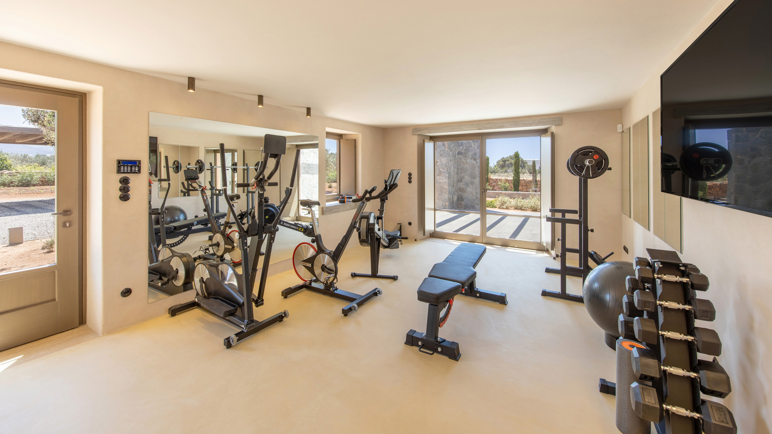 The pool, positioned perpendicular to the coast, is perfect for cooling off during the hottest hours of the day, with a pleasant shaded relaxation area nearby and a well-designed dining space beneath the portico, seamlessly connected to the kitchen to facilitate the work of our chefs. The colors and materials used in the building's design are captivating, with pastel shades rarely seen in this part of Greece, contributing to a relaxing and sophisticated atmosphere.