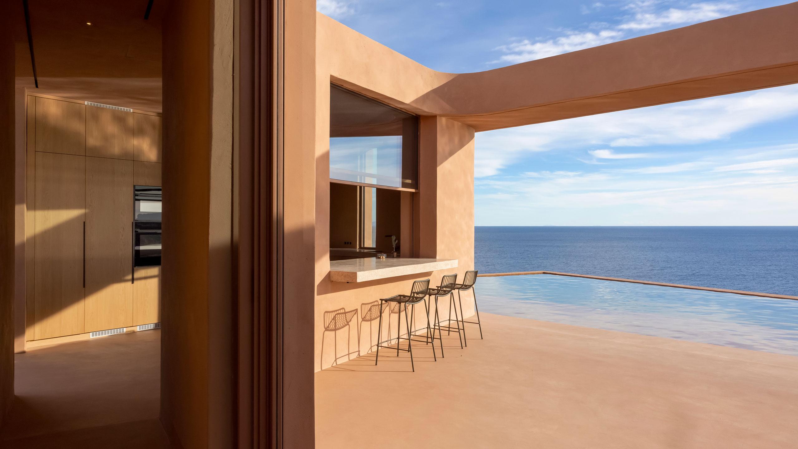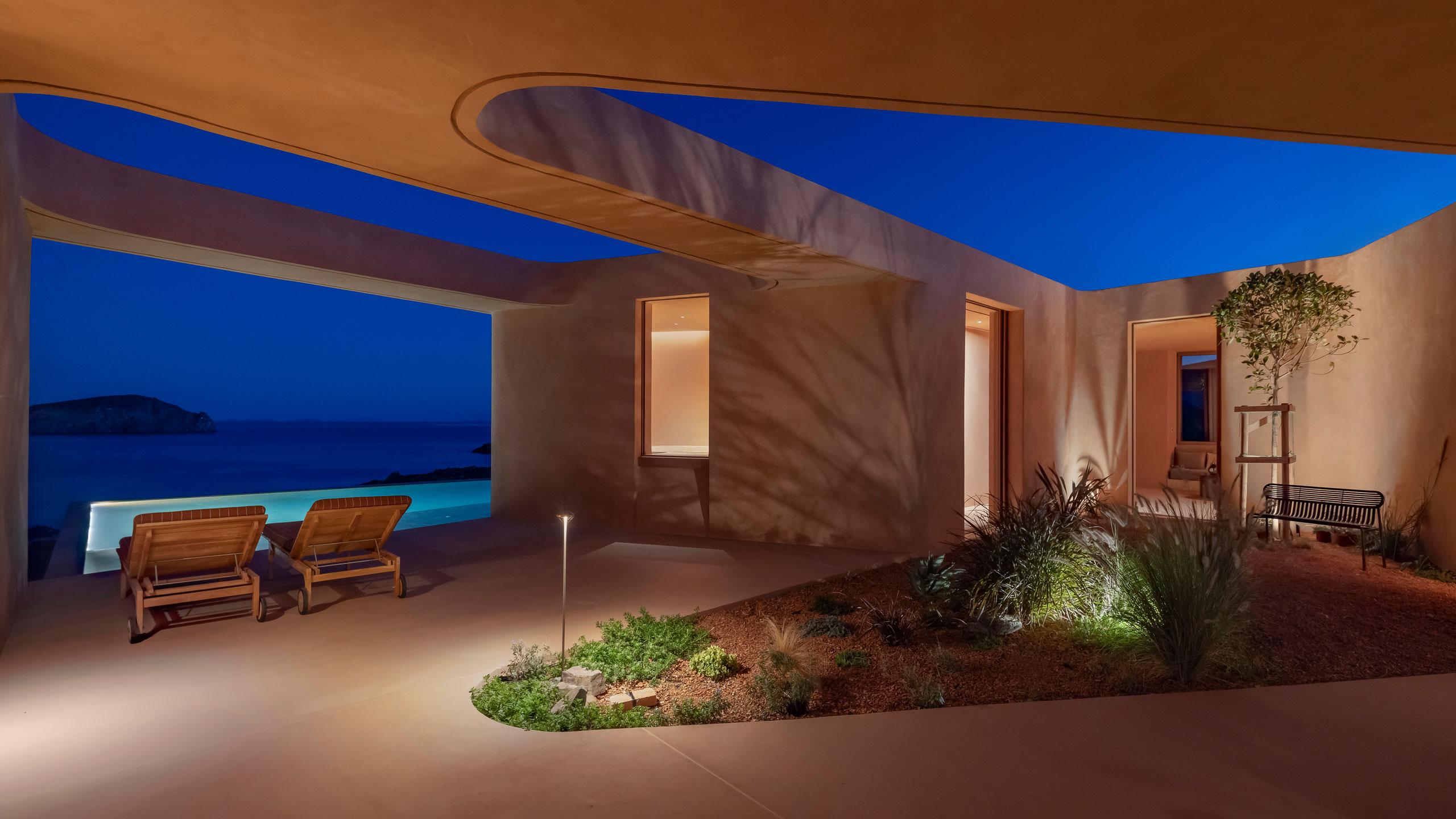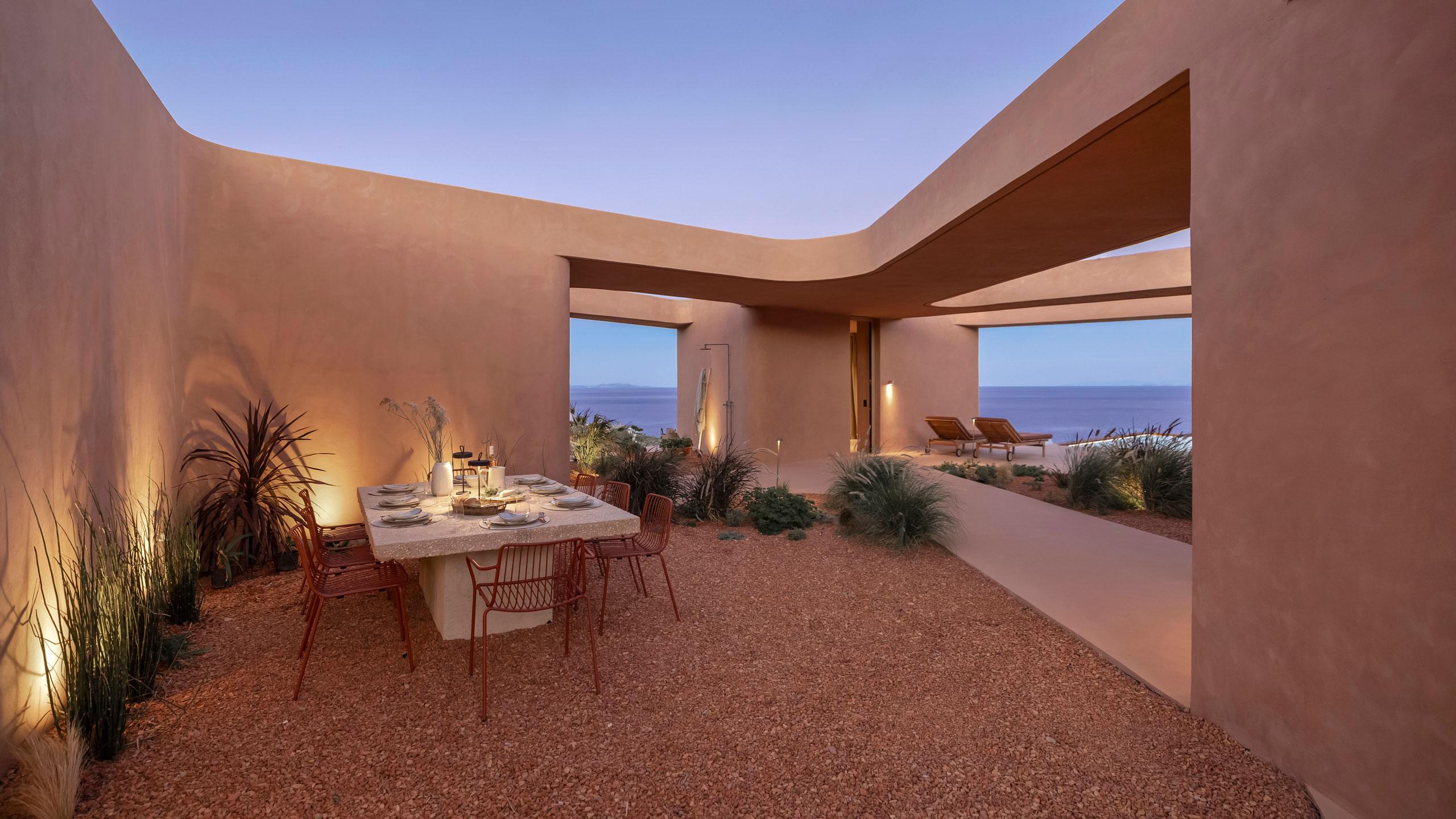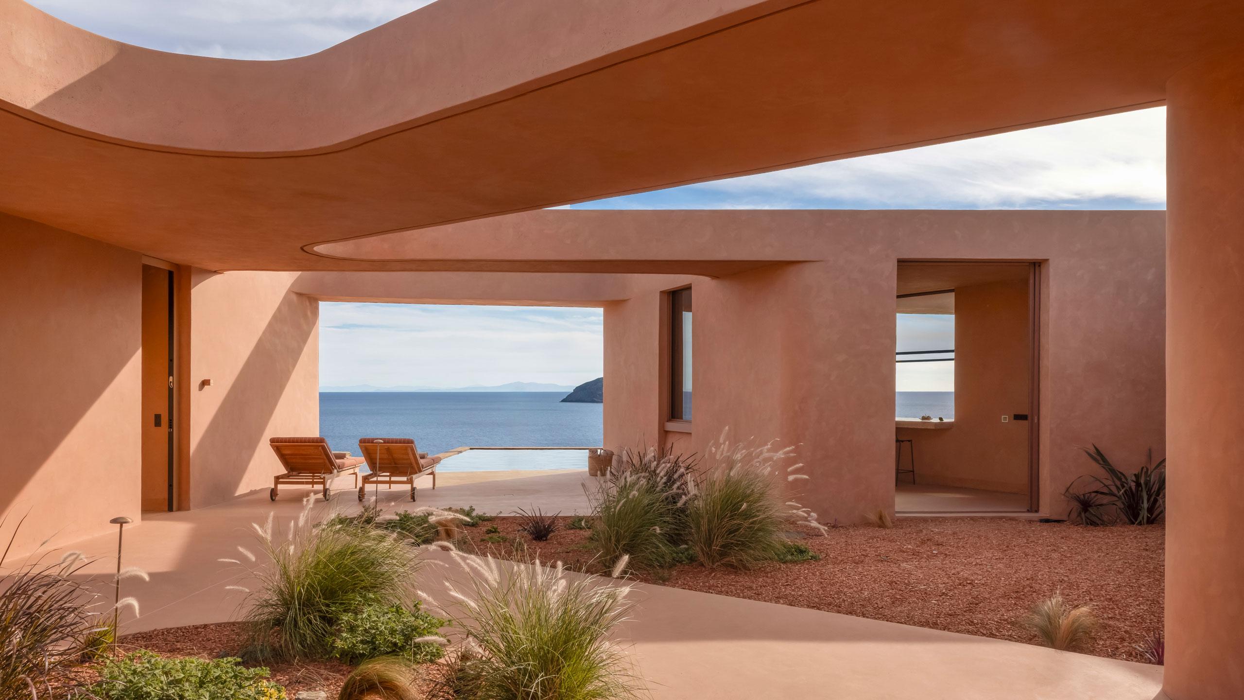 The residence utilizes a monastic blueprint to thoughtfully separate private quarters from shared social hubs, accommodating up to twelve guests across five en-suite bedrooms. Each suite is conceived as an autonomous sanctuary of shadow and light, oriented toward either the expansive sea or the silent protection of internal, landscaped courtyards. These emerald pockets of native planting soften the villa’s sharp geometry, grounding the earth-hued interiors and micro-mosaic finishes within their natural surroundings. The house functions as a continuous loop, an architectural rhythm of opening and closing that allows the individual and the group to coexist without ever competing for space.