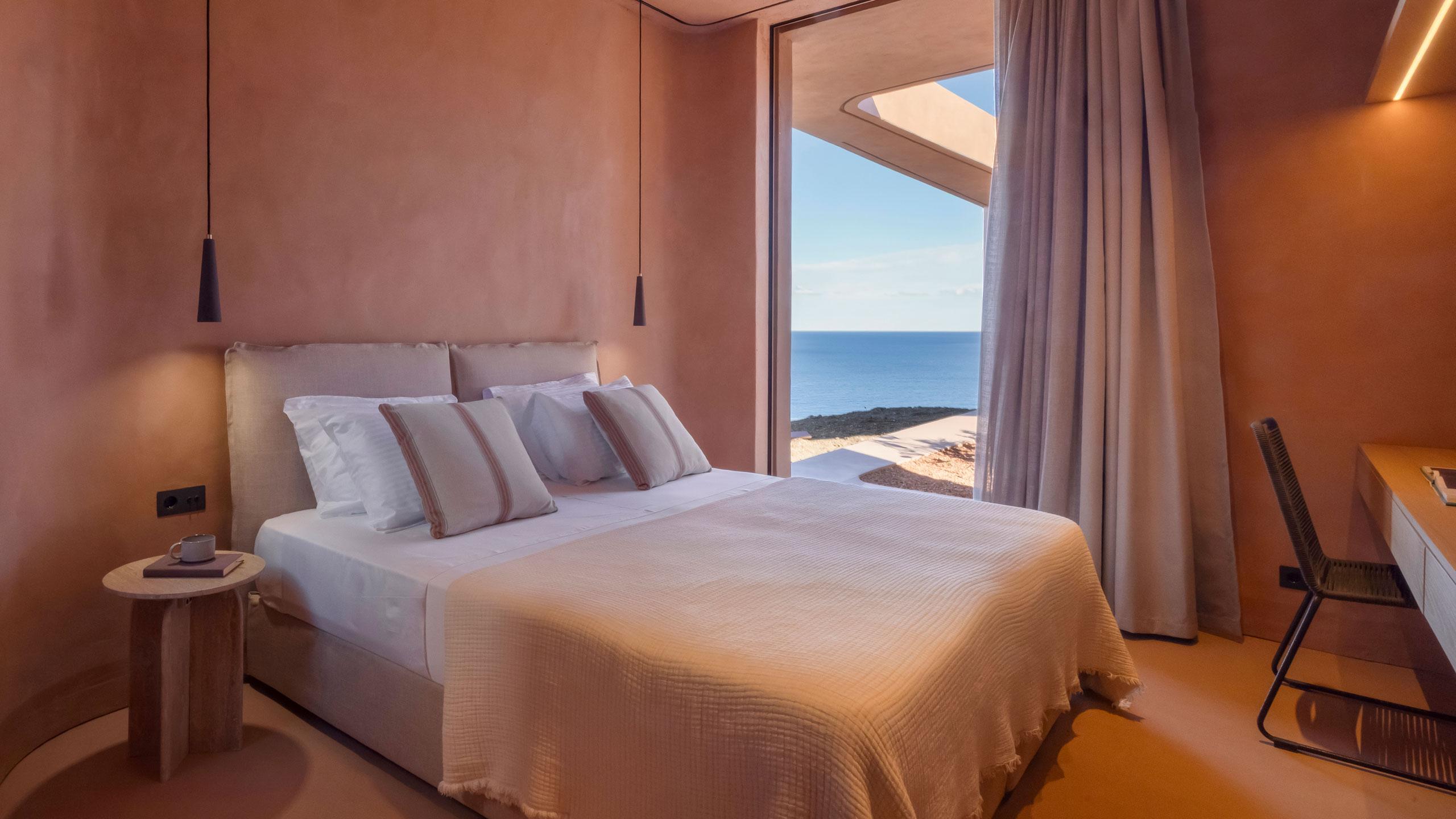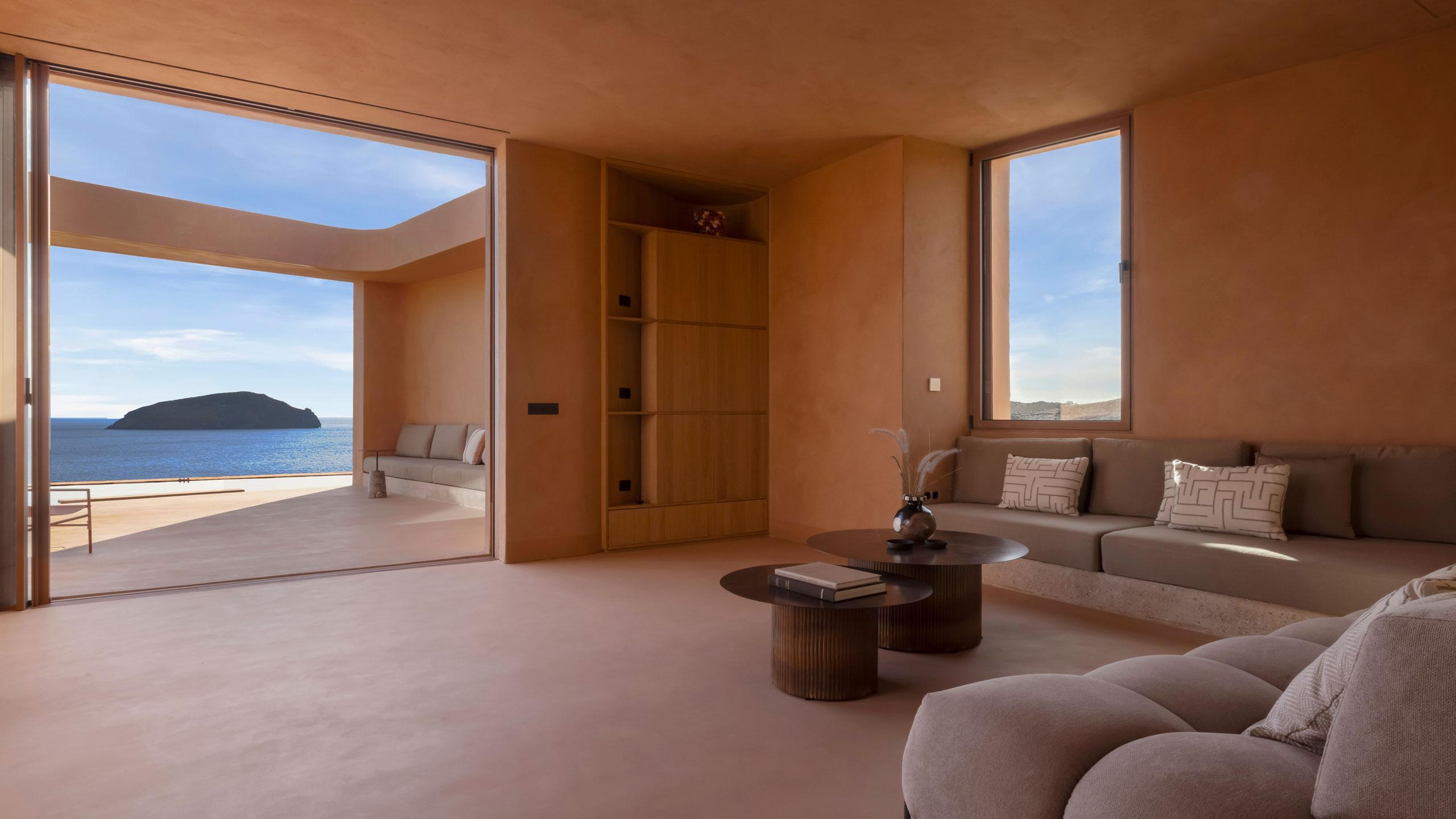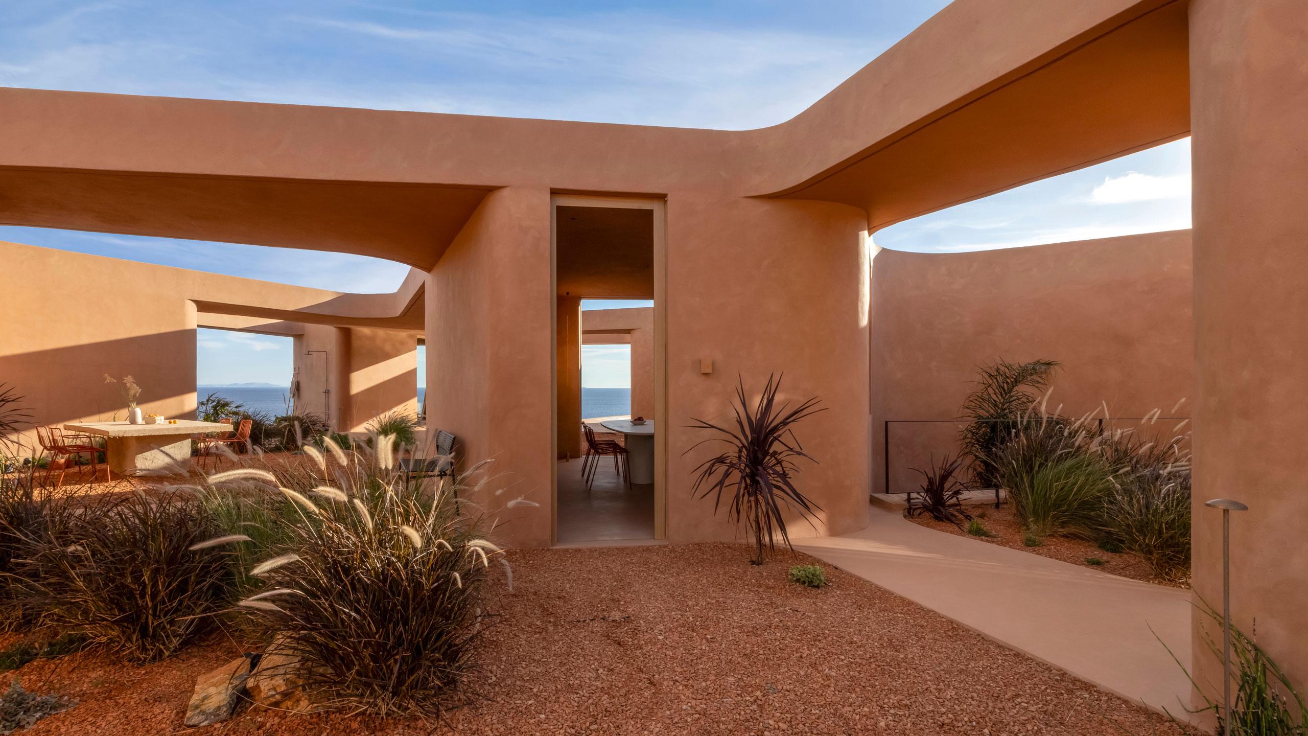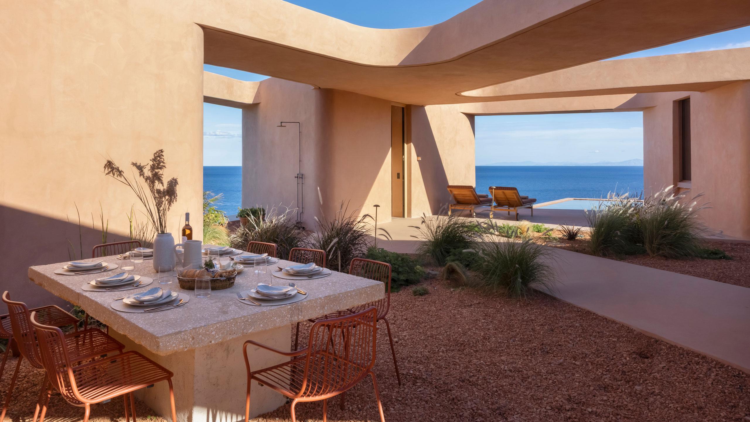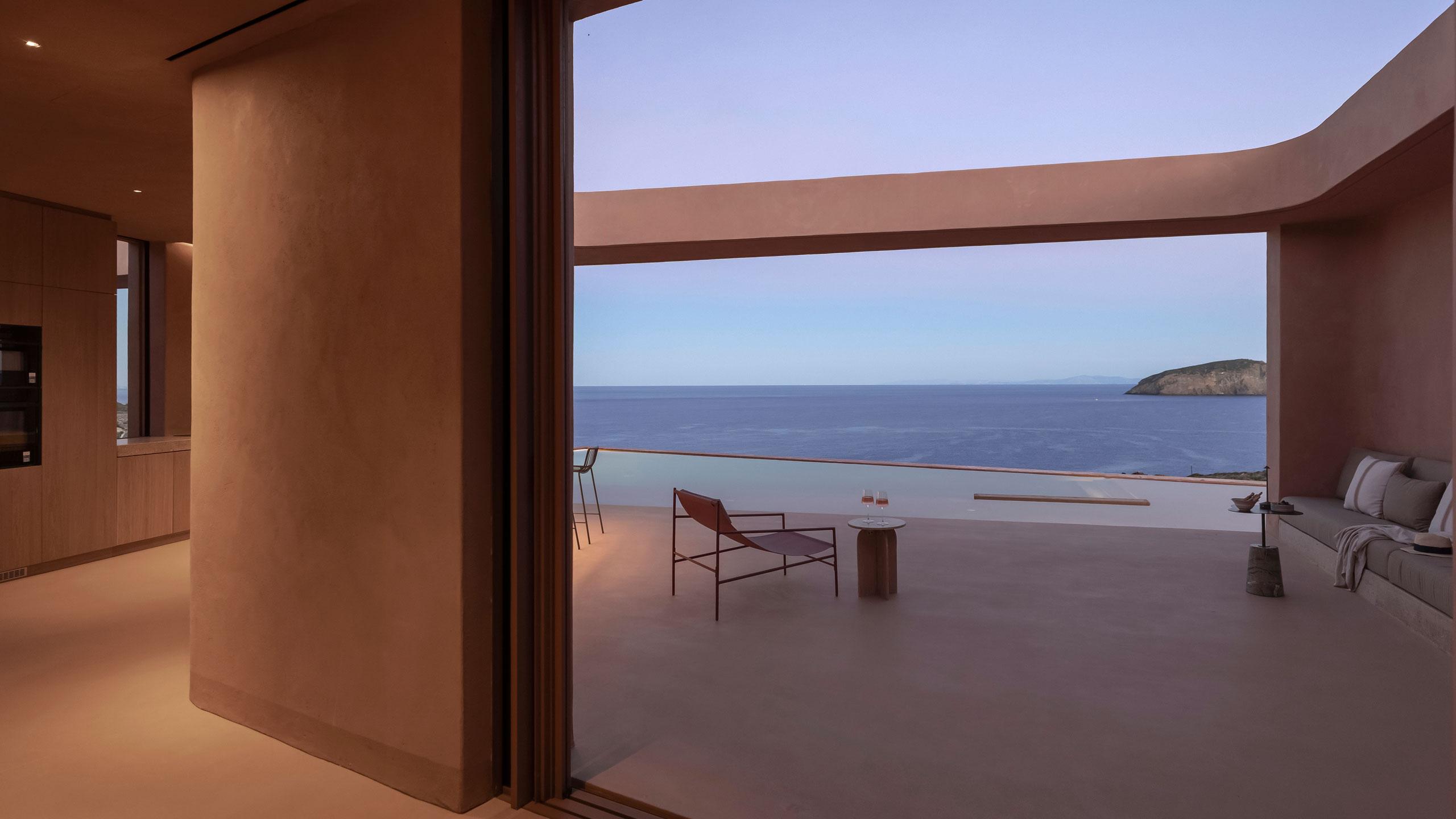 The residence utilizes a monastic blueprint to thoughtfully separate private quarters from shared social hubs, accommodating up to twelve guests across five en-suite bedrooms. Each suite is conceived as an autonomous sanctuary of shadow and light, oriented toward either the expansive sea or the silent protection of internal, landscaped courtyards. These emerald pockets of native planting soften the villa’s sharp geometry, grounding the earth-hued interiors and micro-mosaic finishes within their natural surroundings. The house functions as a continuous loop, an architectural rhythm of opening and closing that allows the individual and the group to coexist without ever competing for space.