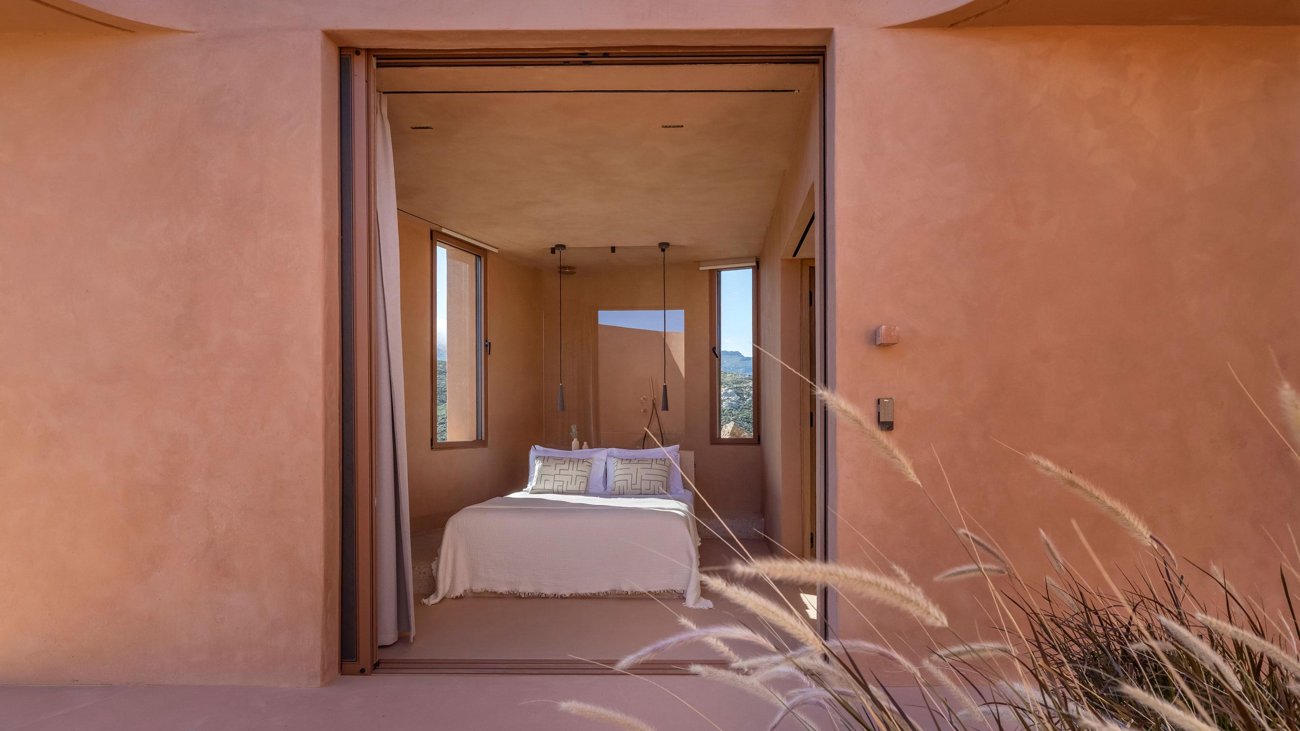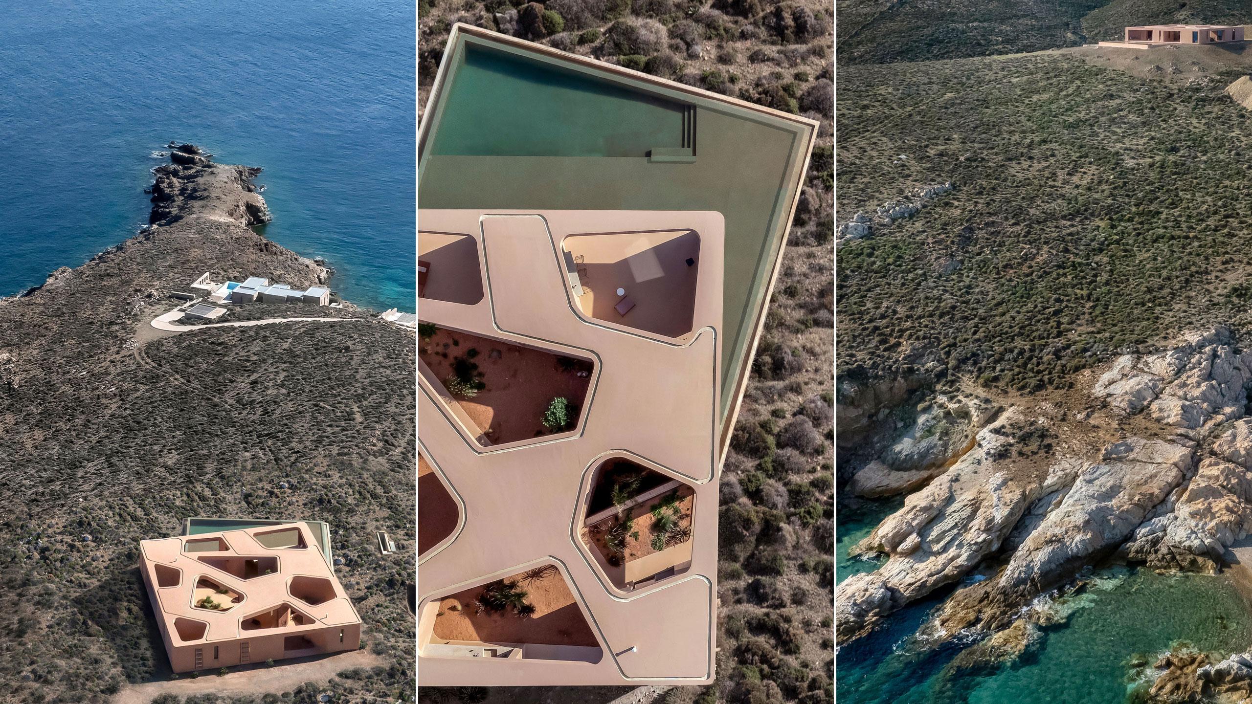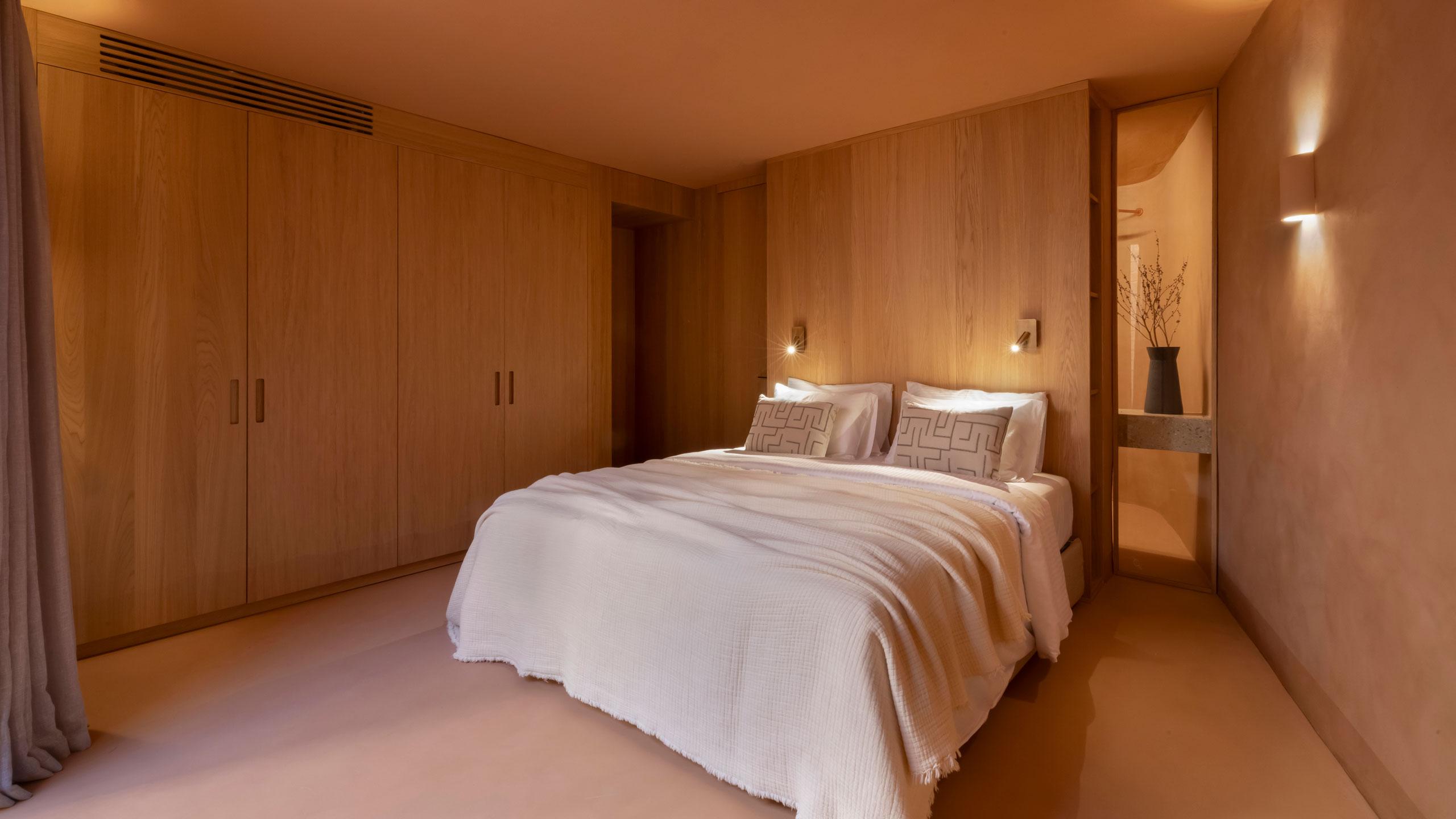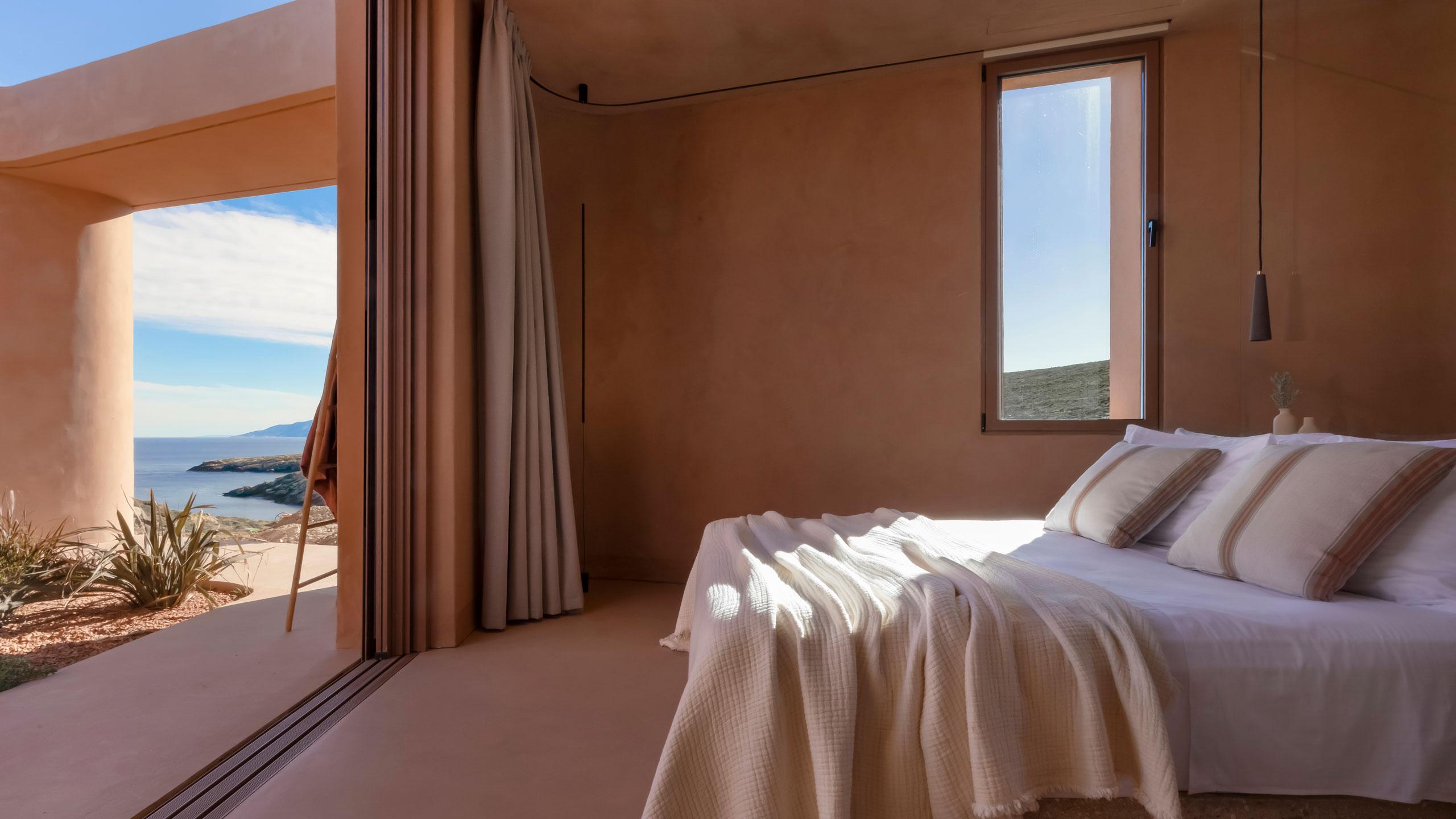The residence utilizes a monastic blueprint to thoughtfully separate private quarters from shared social hubs, accommodating up to twelve guests across five en-suite bedrooms. Each suite is conceived as an autonomous sanctuary of shadow and light, oriented toward either the expansive sea or the silent protection of internal, landscaped courtyards. These emerald pockets of native planting soften the villa’s sharp geometry, grounding the earth-hued interiors and micro-mosaic finishes within their natural surroundings. The house functions as a continuous loop, an architectural rhythm of opening and closing that allows the individual and the group to coexist without ever competing for space.
