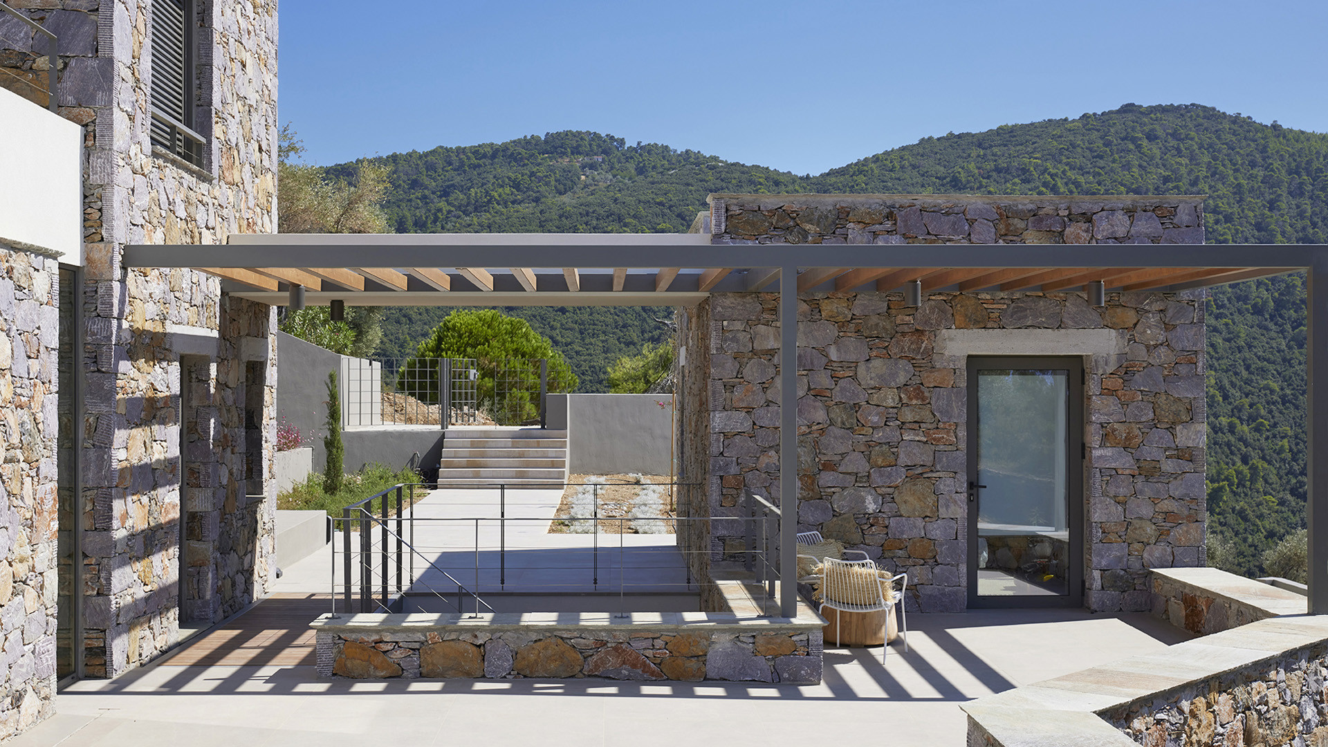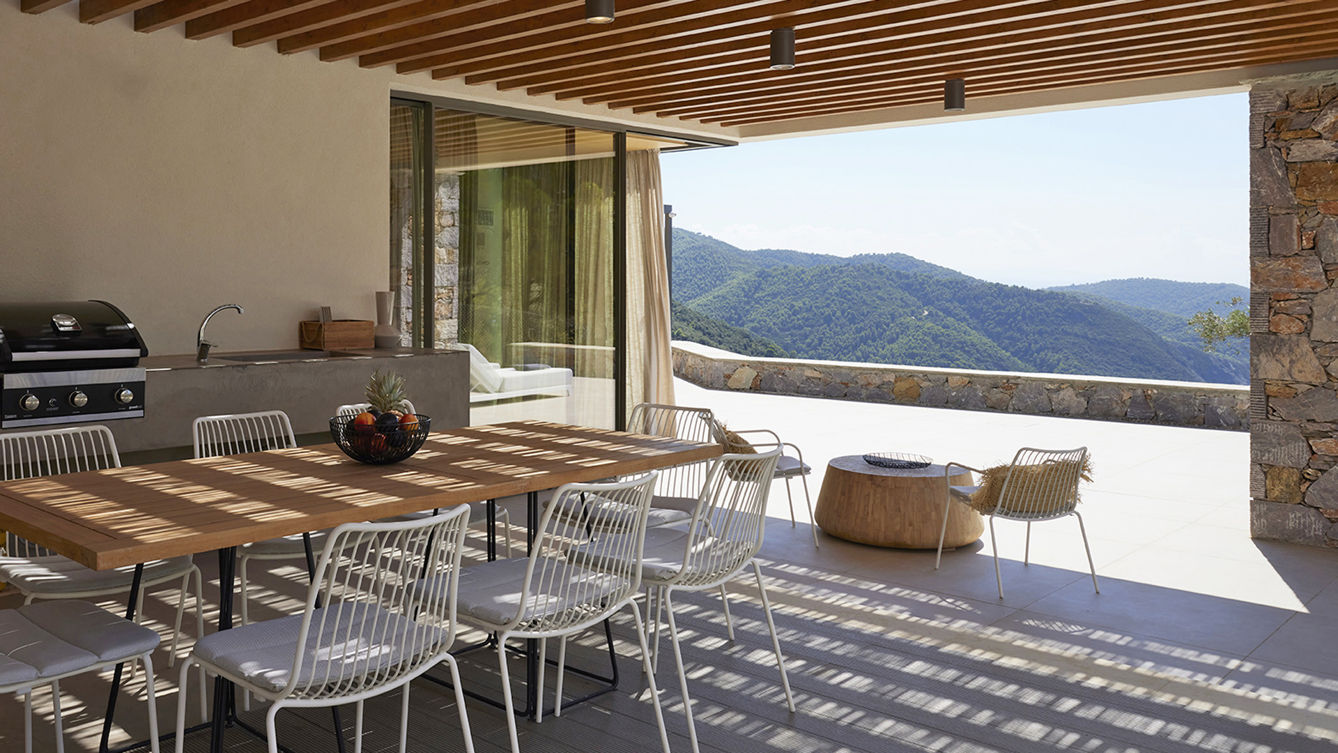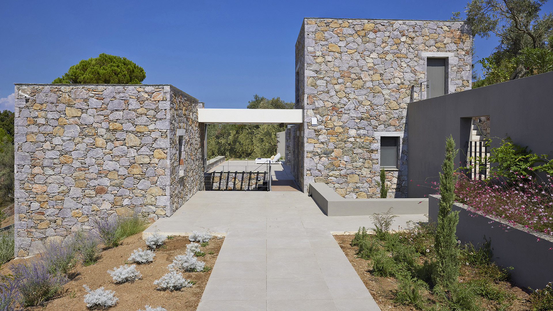 Le linee architettoniche sono decisamente moderne, ma l'edificio risulta in ogni caso perfettamente inserito nel contesto, con le parti in pietra vista che aggiungono calore all'atmosfera, la piscina infinity posizionata su un lato e la comoda e funzionale zona pranzo a breve distanza.