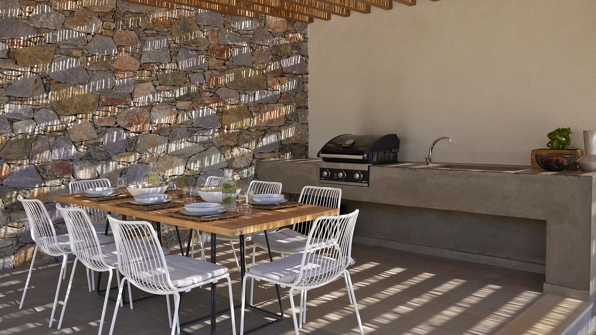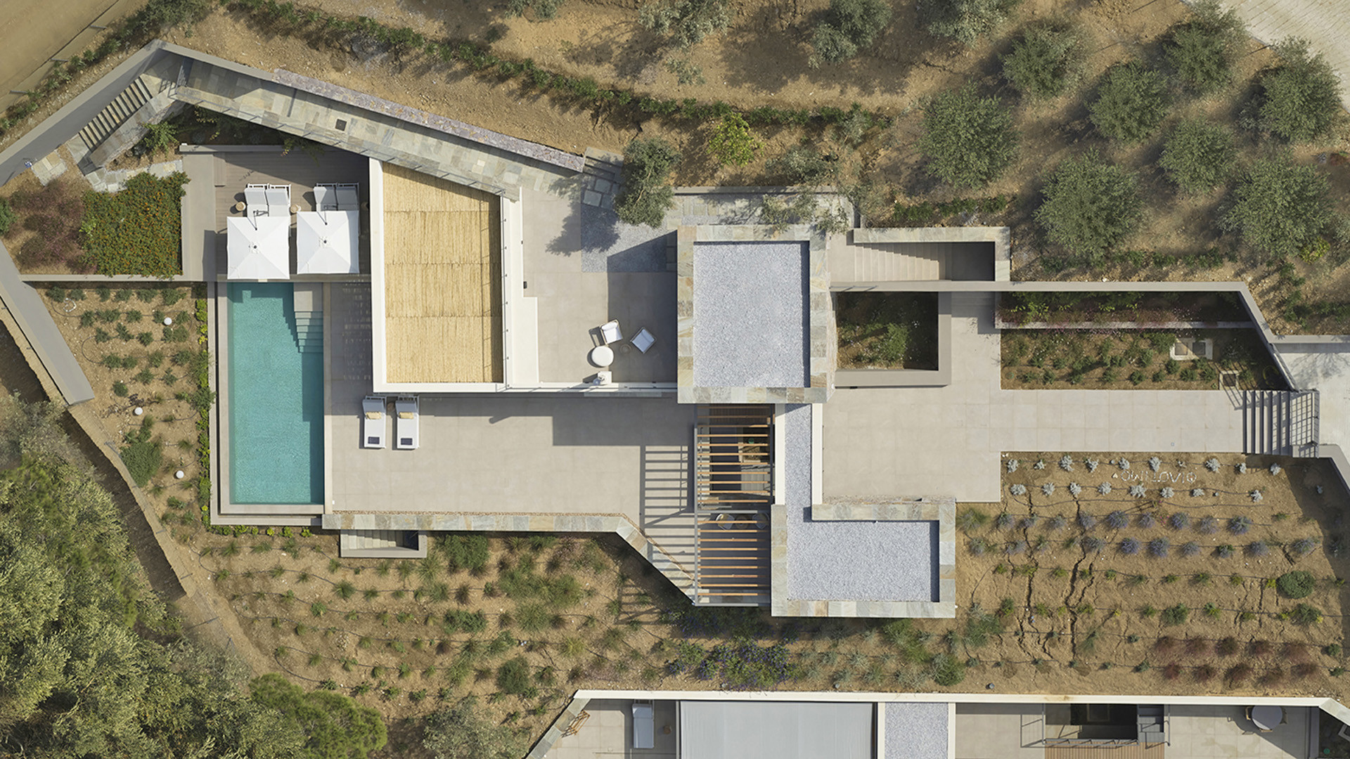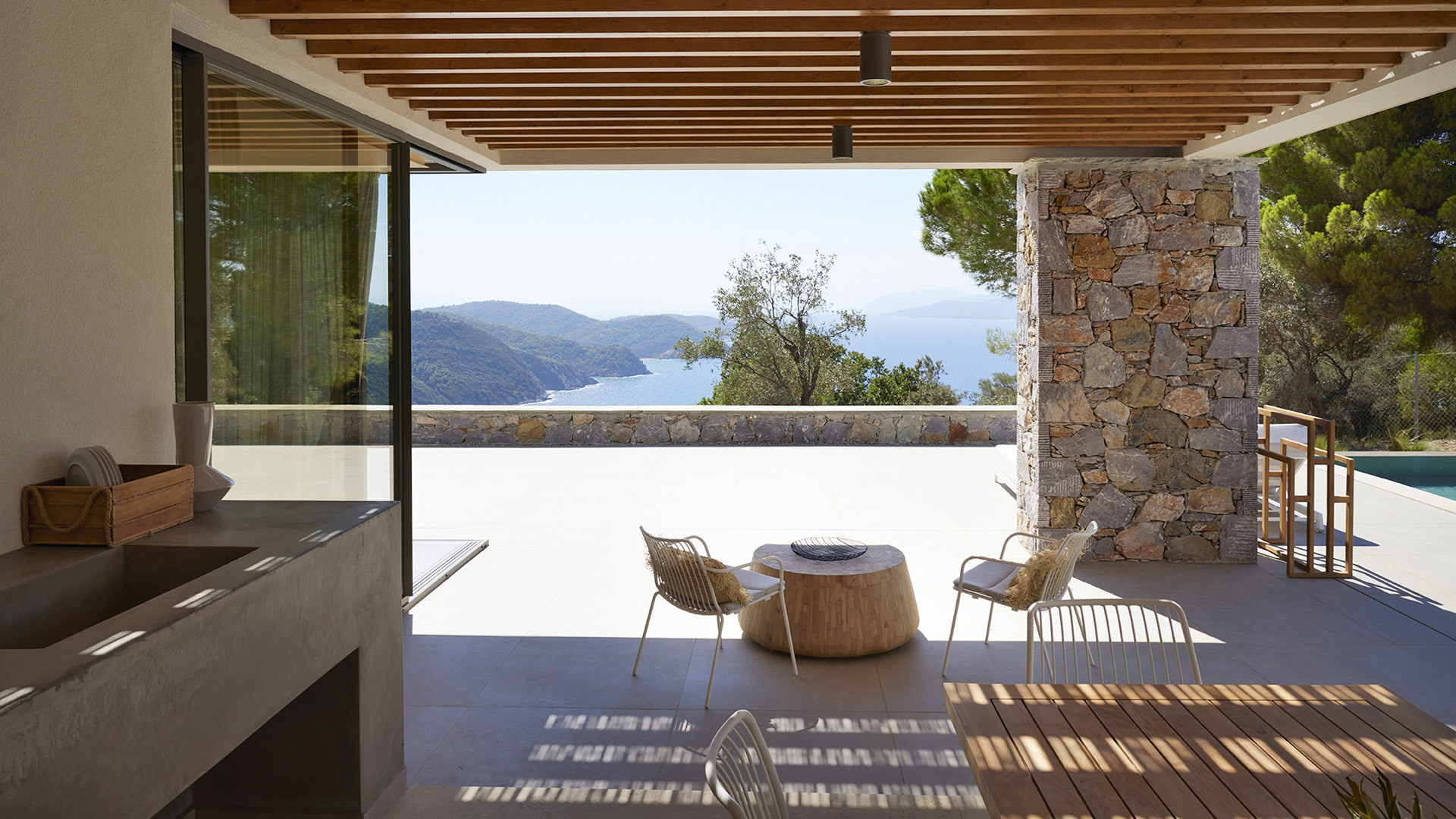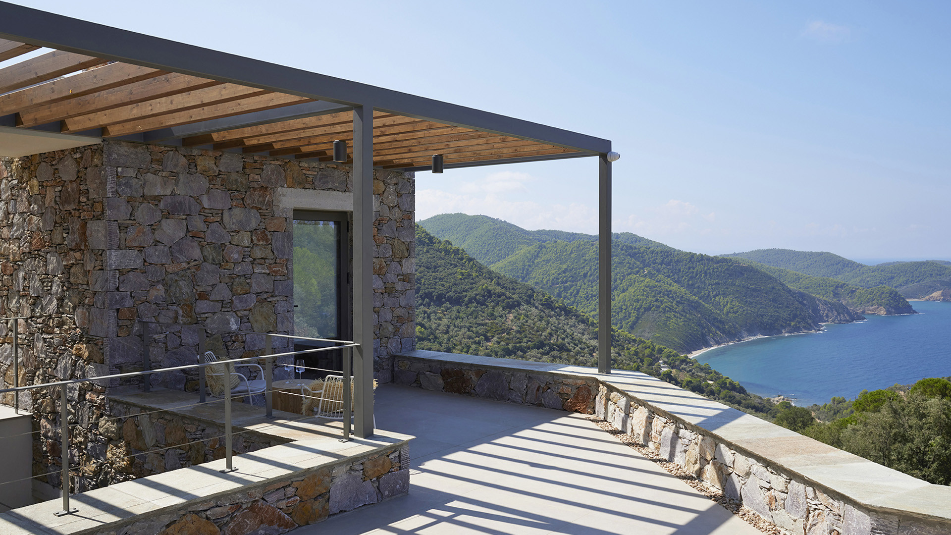 Le linee architettoniche sono decisamente moderne, ma l'edificio risulta in ogni caso perfettamente inserito nel contesto, con le parti in pietra vista che aggiungono calore all'atmosfera, la piscina infinity posizionata su un lato e la comoda e funzionale zona pranzo a breve distanza.