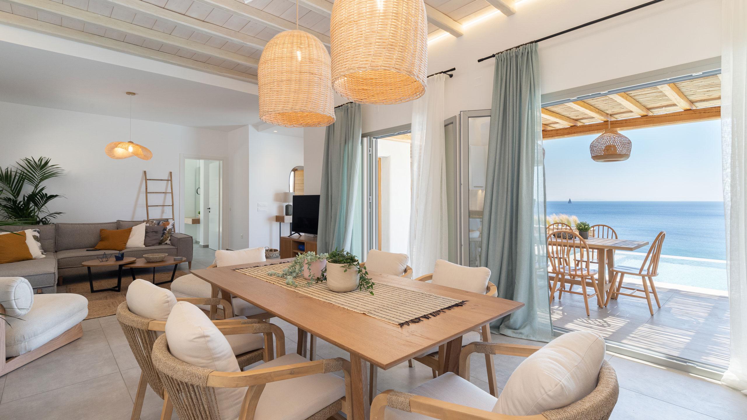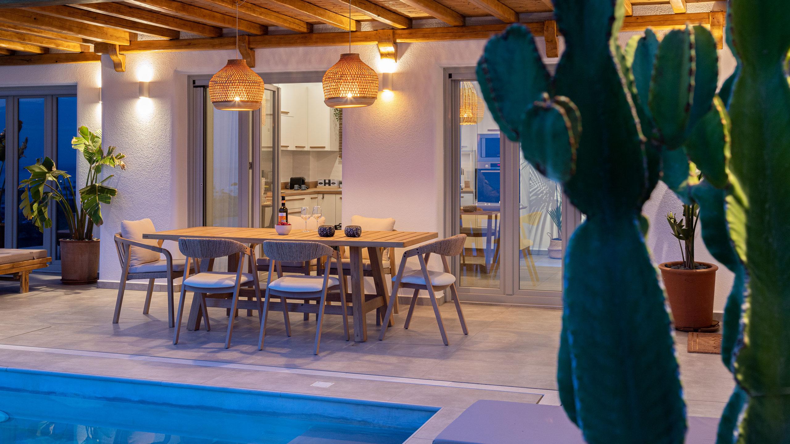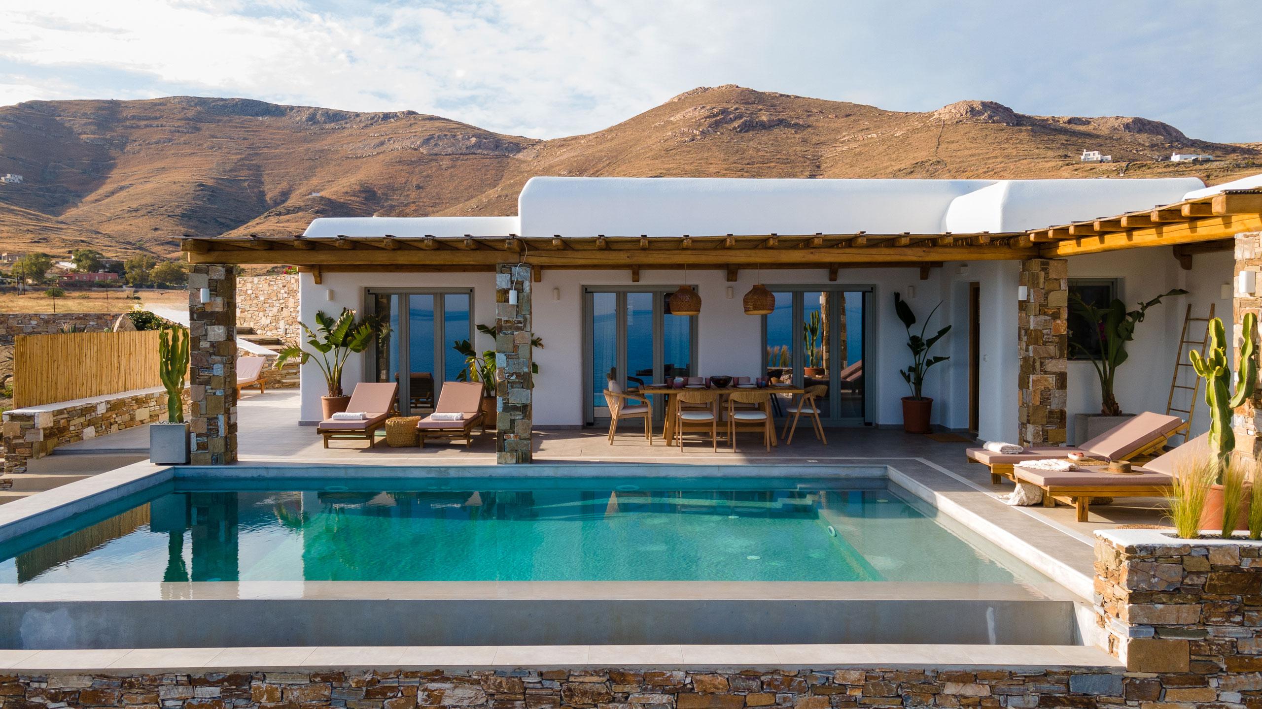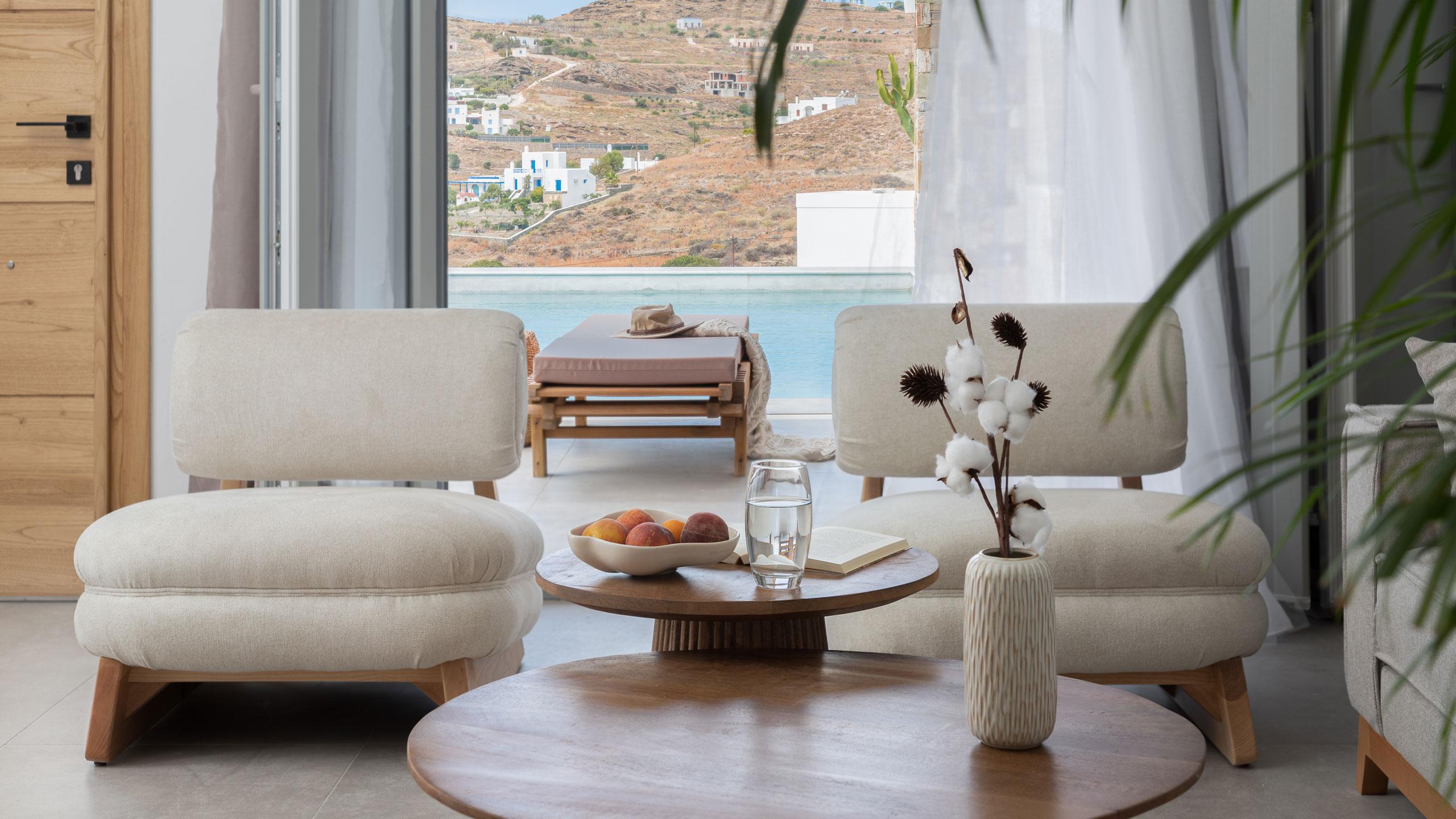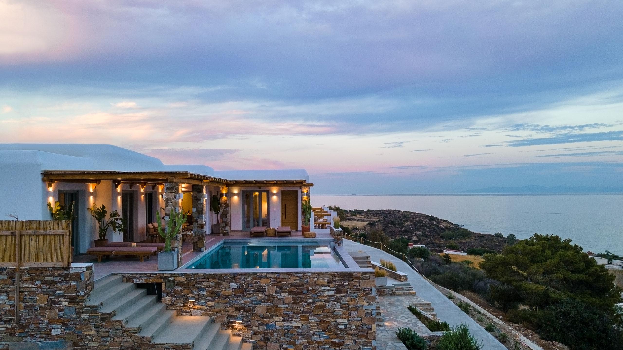 The estate is comprised of two independent wings, the East and West, which can be booked individually or together to host up to 14 guests in absolute comfort. Located just 12 minutes from the vibrant culture of Ermoupolis, you are perfectly positioned between cosmopolitan beach clubs and secret, white-pebble coves hidden just a short walk away. From sun-drenched gatherings by the pools to quiet evenings overlooking the water, every moment here is crafted for unforgettable memories under the Syros sun.