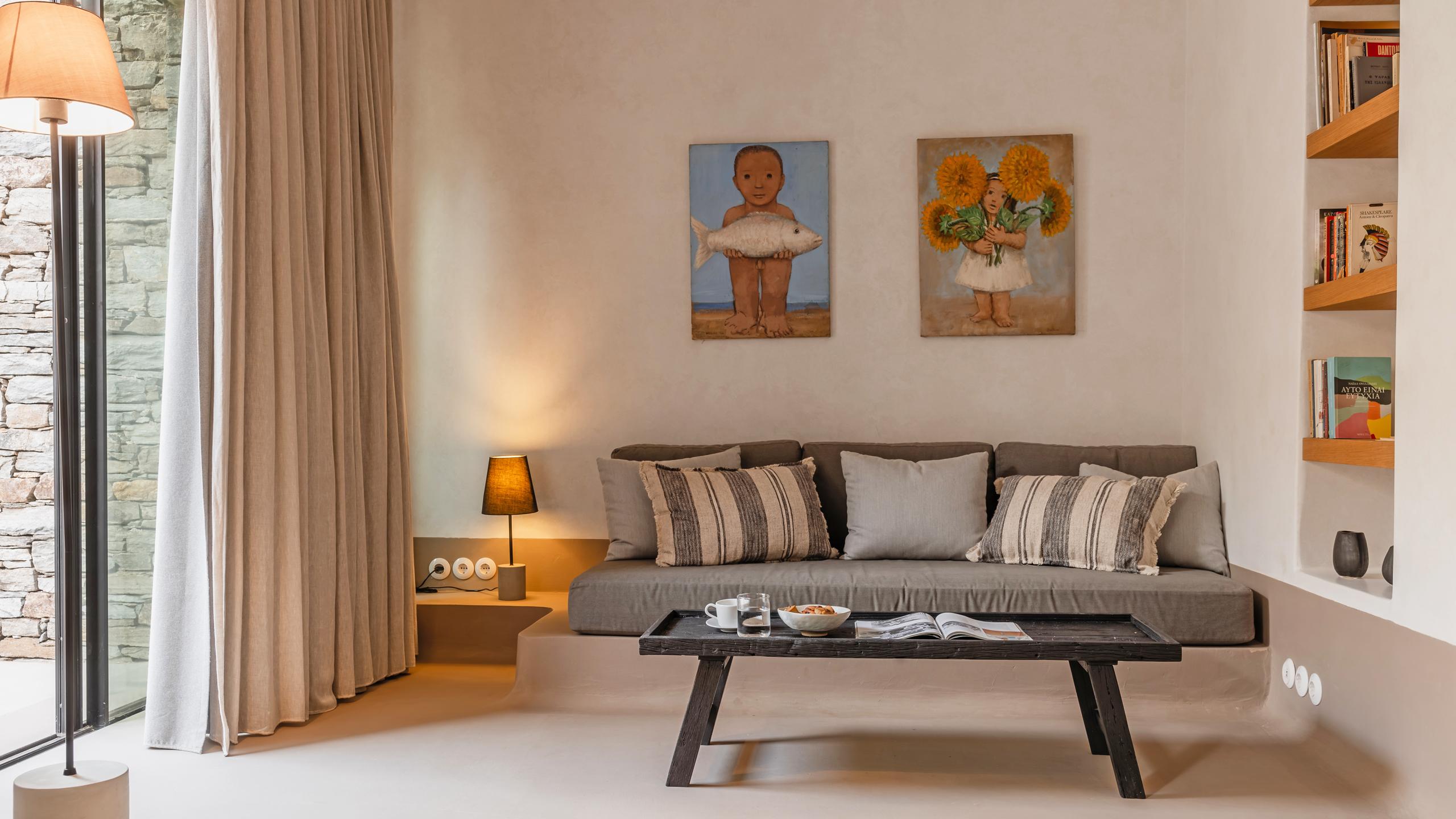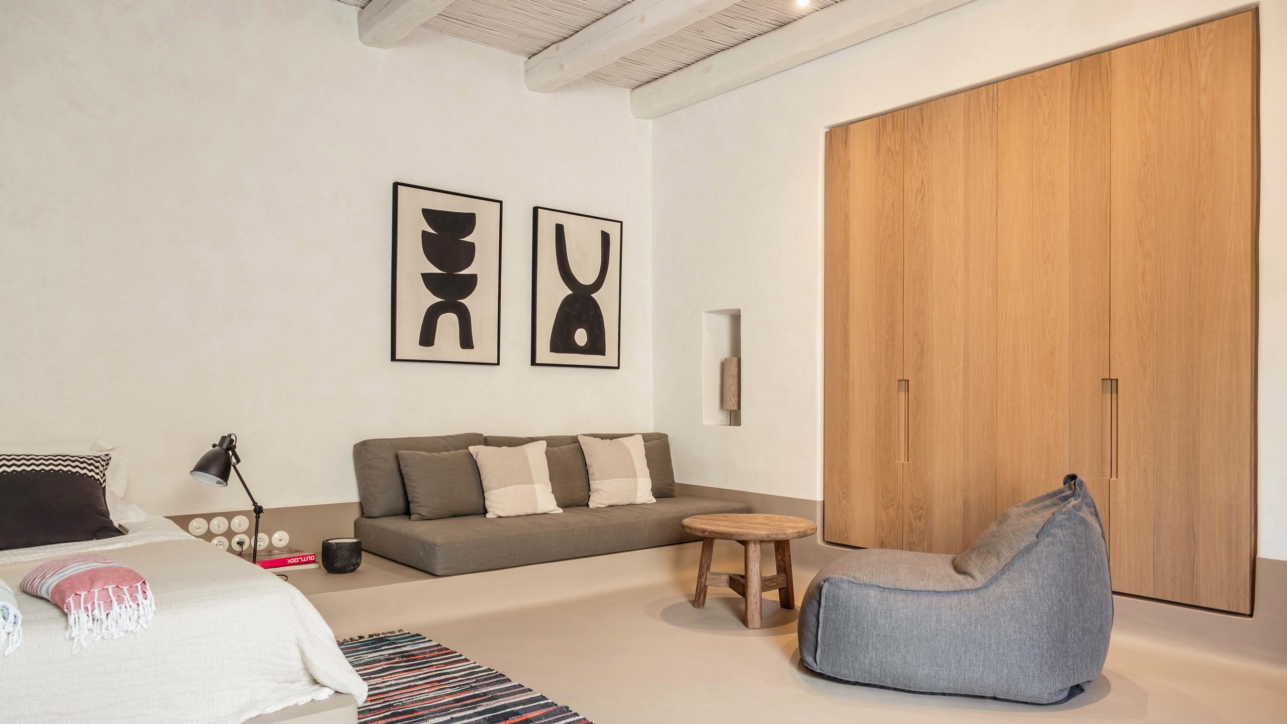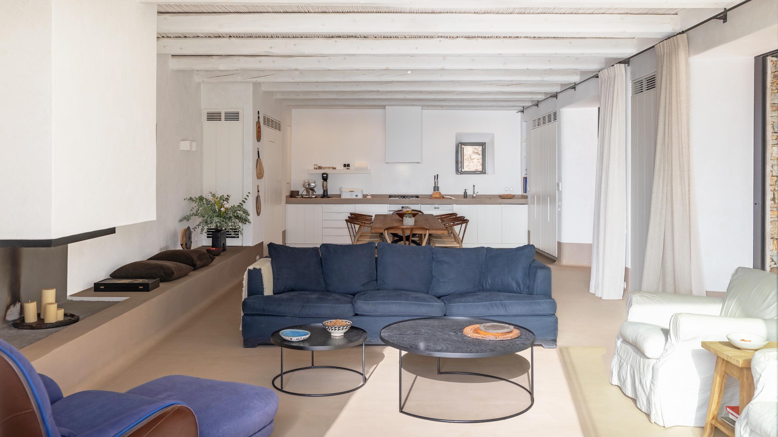 Step outside to find a sprawling 15-meter infinity pool and shaded pergolas that create an atmospheric haven for dining and relaxation. A private path leads you just 280 meters down to the golden sands and crystal-clear waters of Platia Ammos beach. This is an idyllic retreat for those seeking a sophisticated balance of privacy, contemporary comfort, and unspoiled coastal beauty.